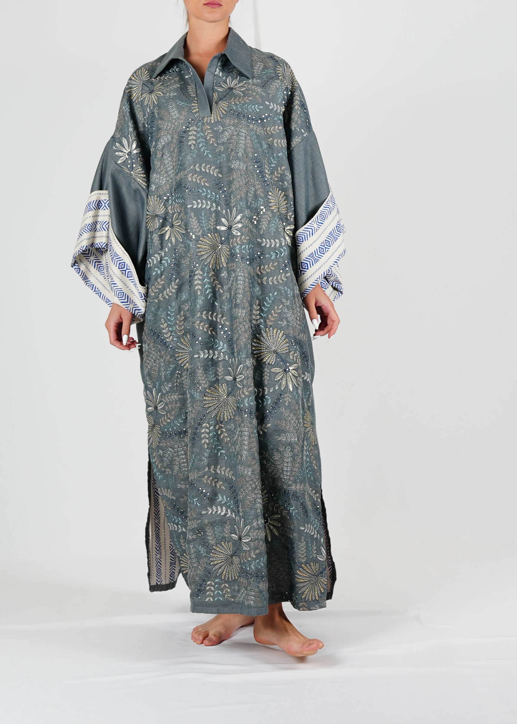 قفطان رمادي مطرز من الكتان بأكمام هندسية - مقاس واحد، طول 55 بوصة