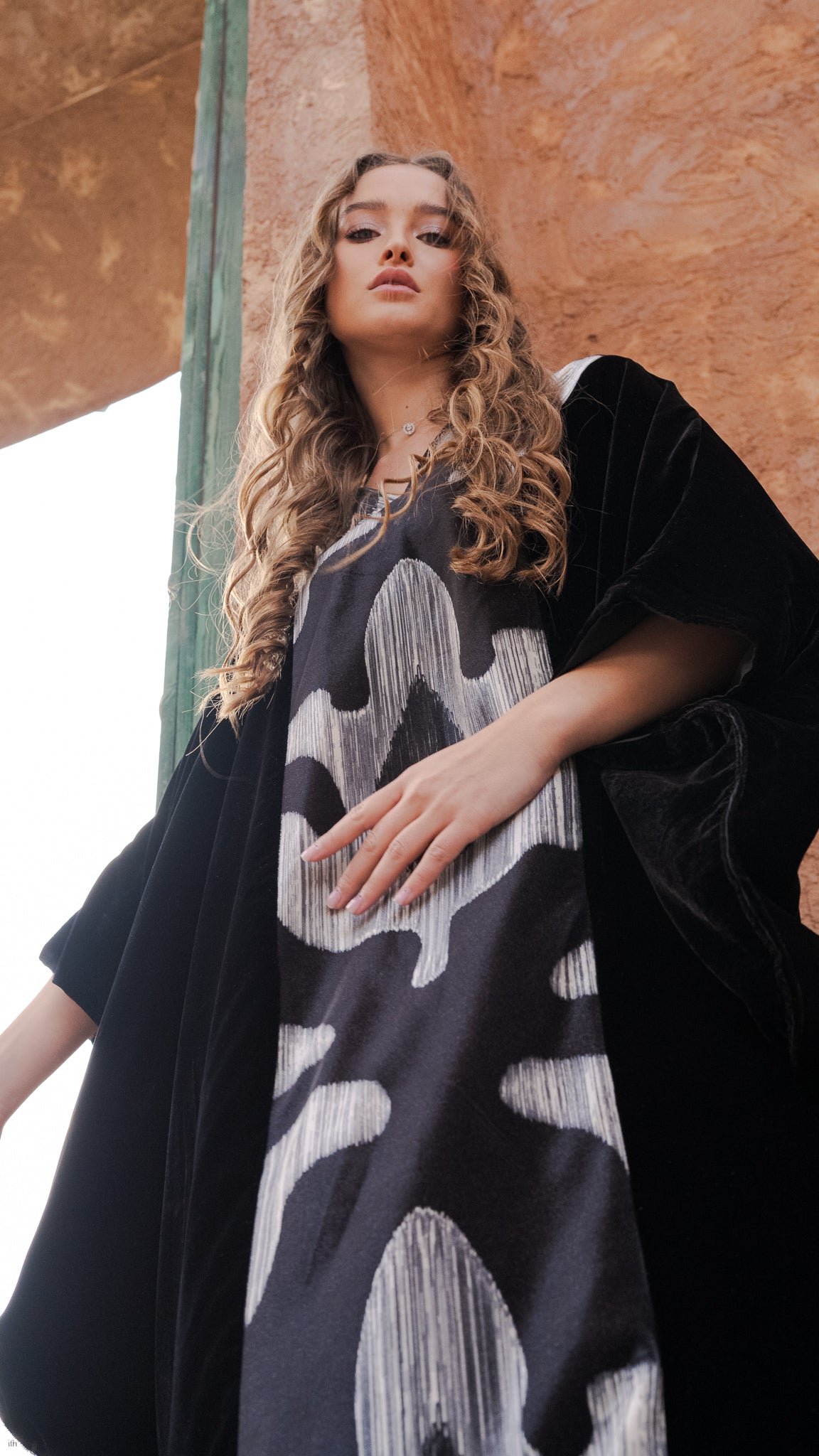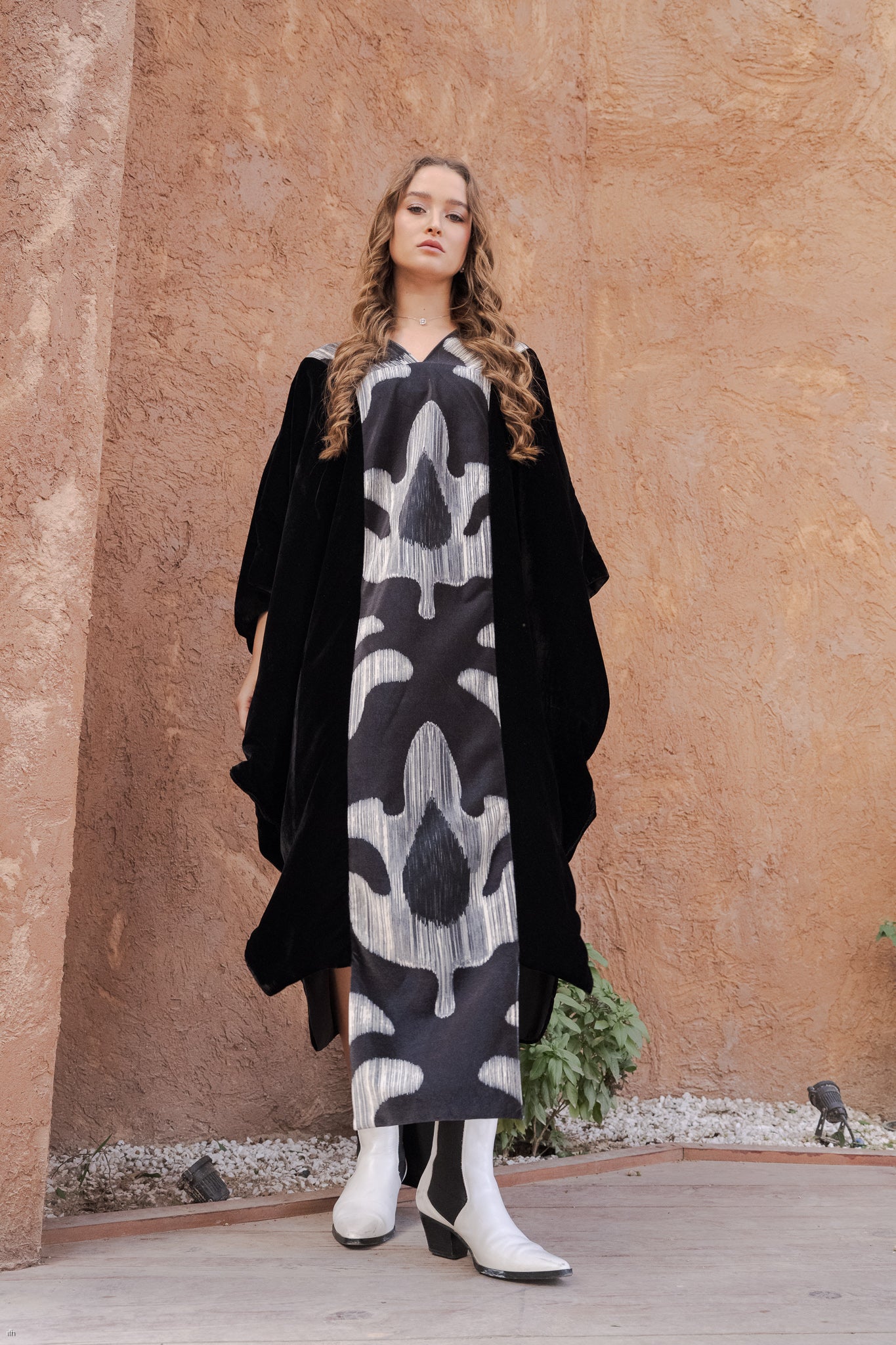 Elevate your wardrobe with this Black Velvet Kaftan, crafted from premium velvet for a soft, rich texture and a fluid, elegant drape. The design features a striking central ikat-inspired woven panel in contrasting tones, adding modern artistry while preserving a refined, understated aesthetic.
