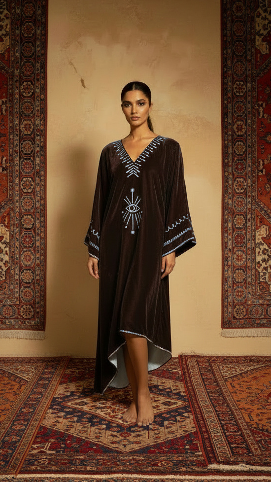 استمتعي بأناقة الحرف اليدوية مع هذا القفطان المصنوع من الحرير المخملي باللون البني الشوكولاتي. مصنوع من مخمل حريري فاخر بنسبة 100%، يتميز هذا القفطان بتطريز معقد يدويًا على شكل "عين الحماية" على الجهة الأمامية، محاط بتفاصيل مستوحاة من السماء. الأكمام العريضة مزينة بتطريز هندسي، مما يضيف لمسة فريدة ومعاصرة للصورة الظلية التقليدية.