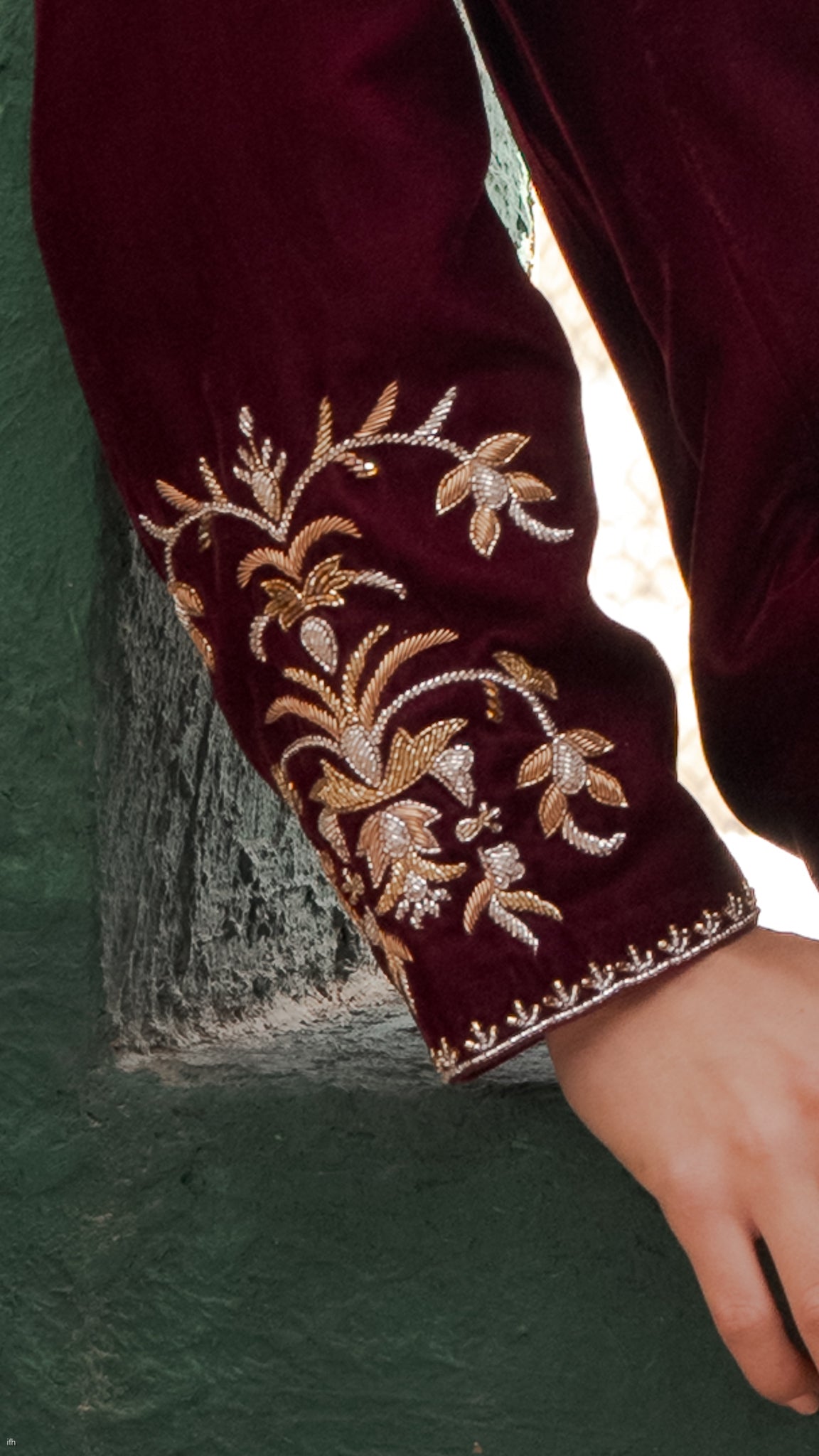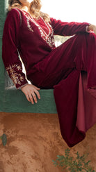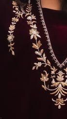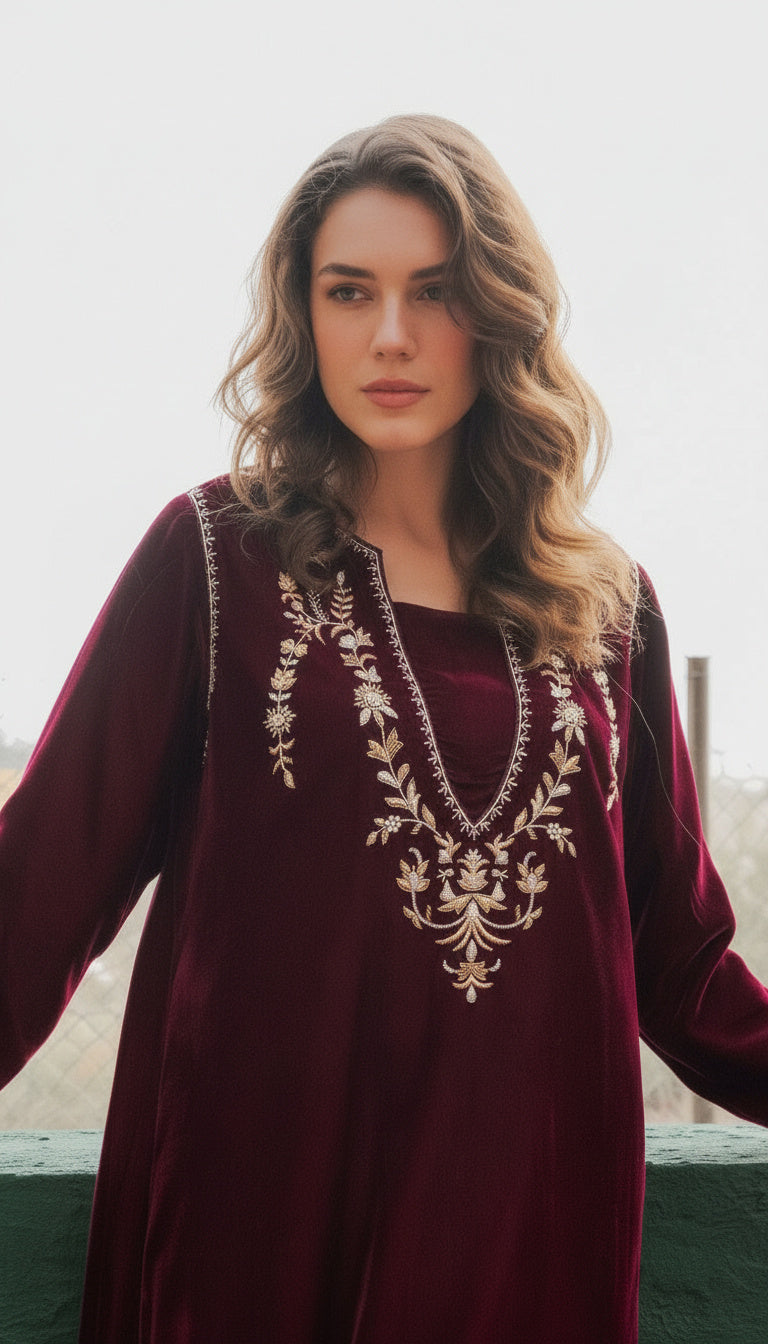أضيفي لمسة من الرقي إلى خزانة ملابسك مع هذا الفستان المخملي بلون المارون، المصنوع من مخمل حريري خالص ليمنحكِ ملمساً فاخراً وانسيابية أنيقة. يتميز التصميم بتطريزات يدوية دقيقة على طول خط العنق والأكمام، مما يضفي عليه طابعاً حرفياً مميزاً مع الحفاظ على جمالية خالدة وبسيطة.