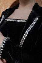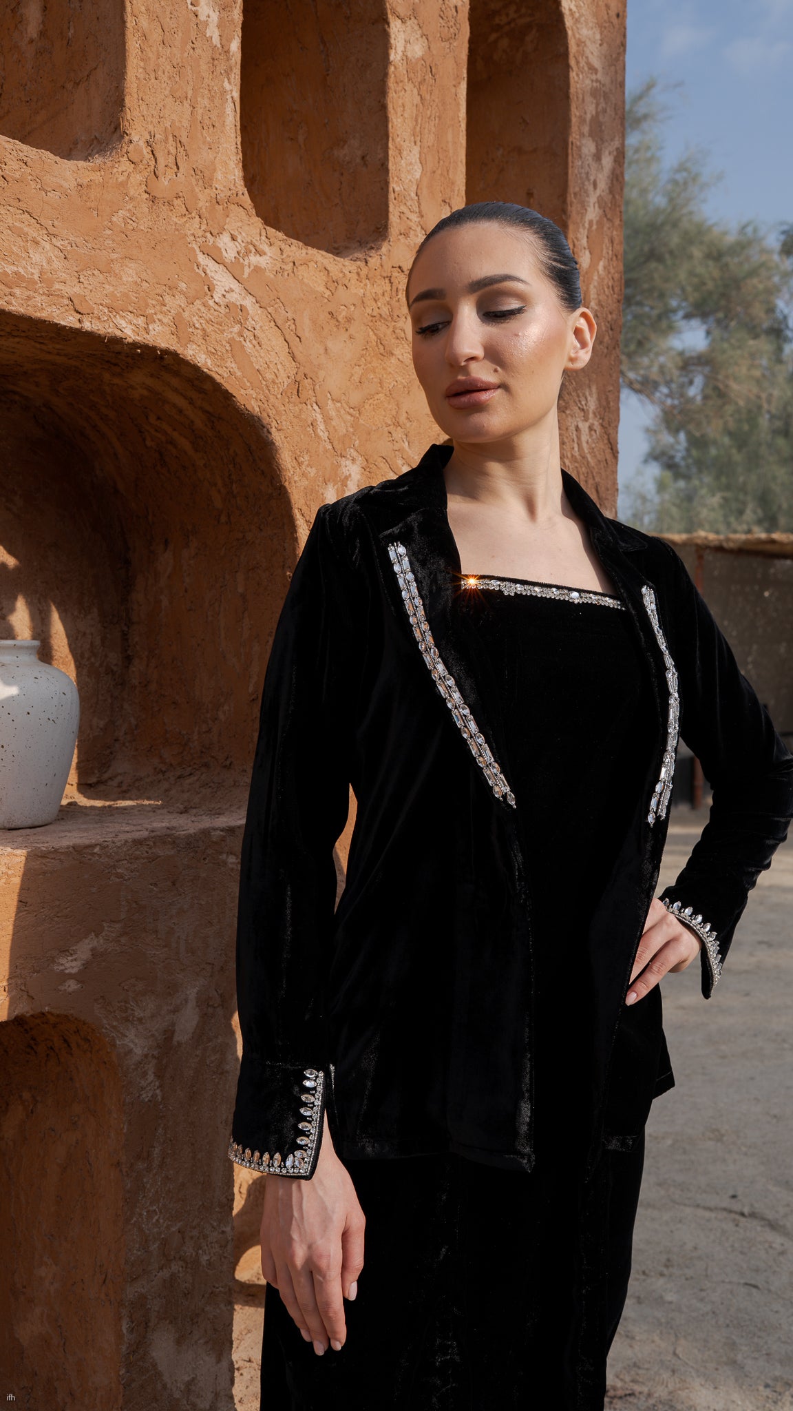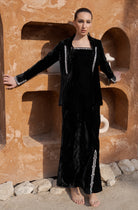 Elevate your evening wardrobe with this refined black velvet kaftan, crafted from 100% pure silk velvet for a rich texture and fluid, elegant drape. The design is elevated with hand-finished crystal glass detailing along the neckline and cuffs, adding a subtle shimmer while maintaining a timeless, understated aesthetic.