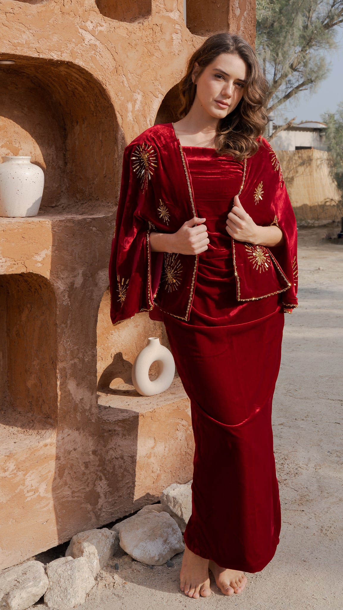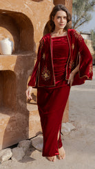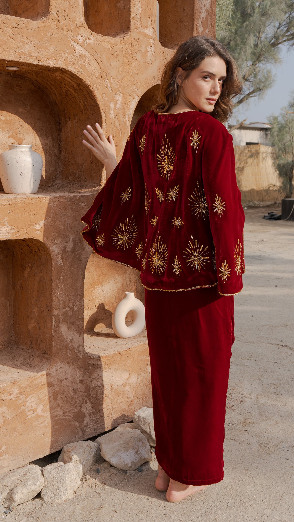 Elevate your wardrobe with this Burgundy Velvet Kaftan, crafted from 100% pure silk velvet for a rich texture and a fluid, elegant drape. The design is distinguished by intricate hand-embroidered starburst motifs across the sleeves and edges, finished with delicate gold-toned detailing that adds refined artisanal character while preserving a timeless, sophisticated aesthetic.