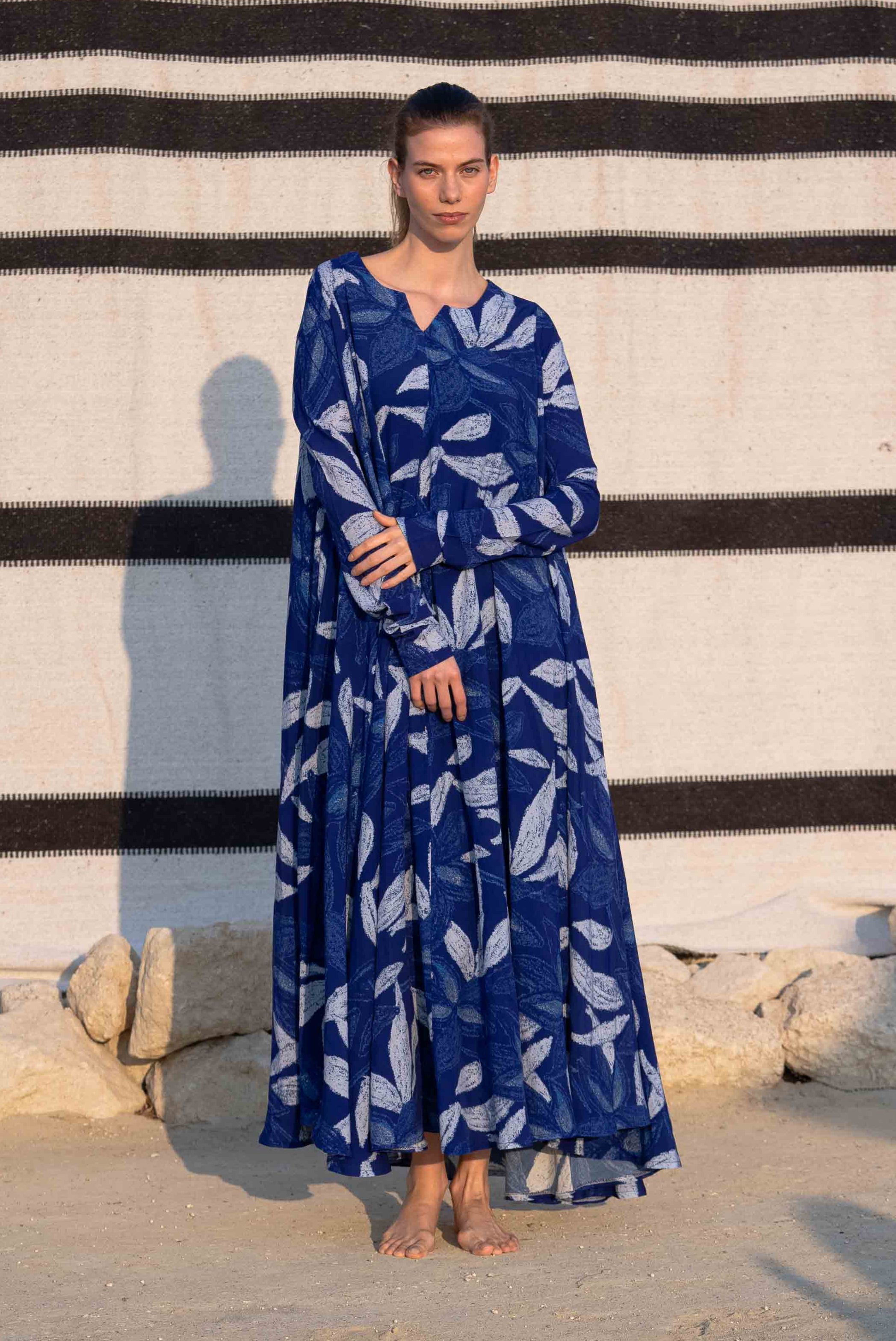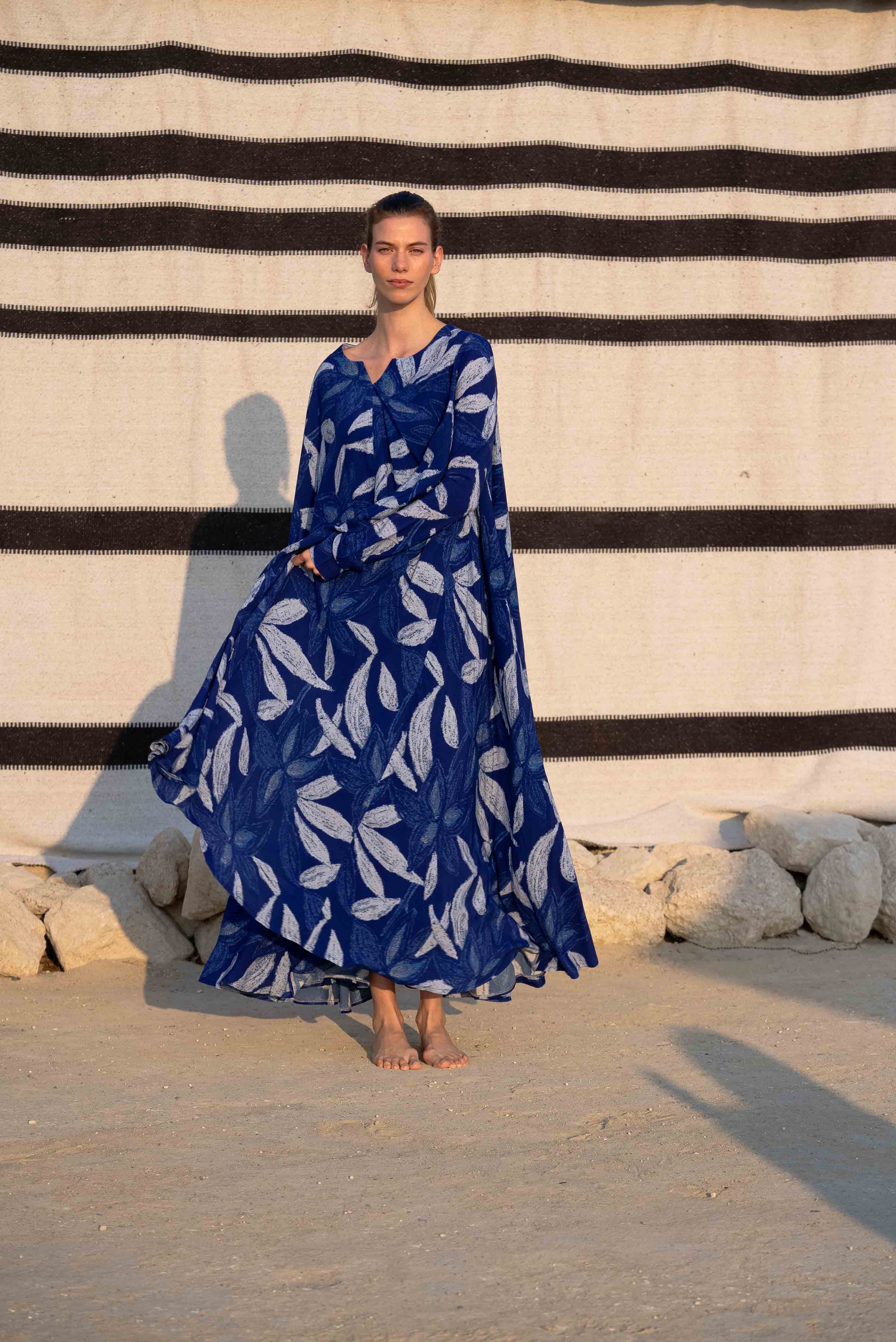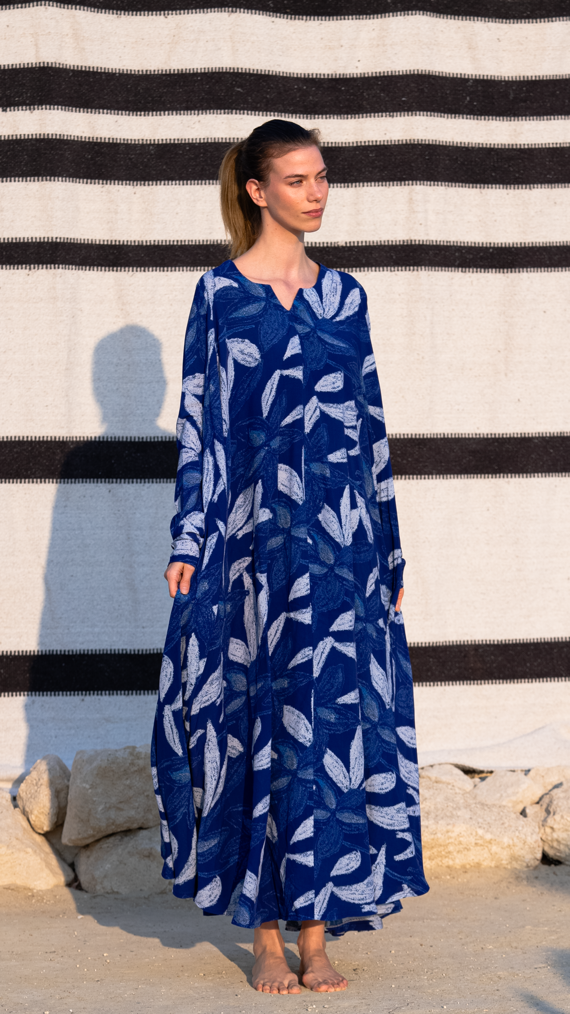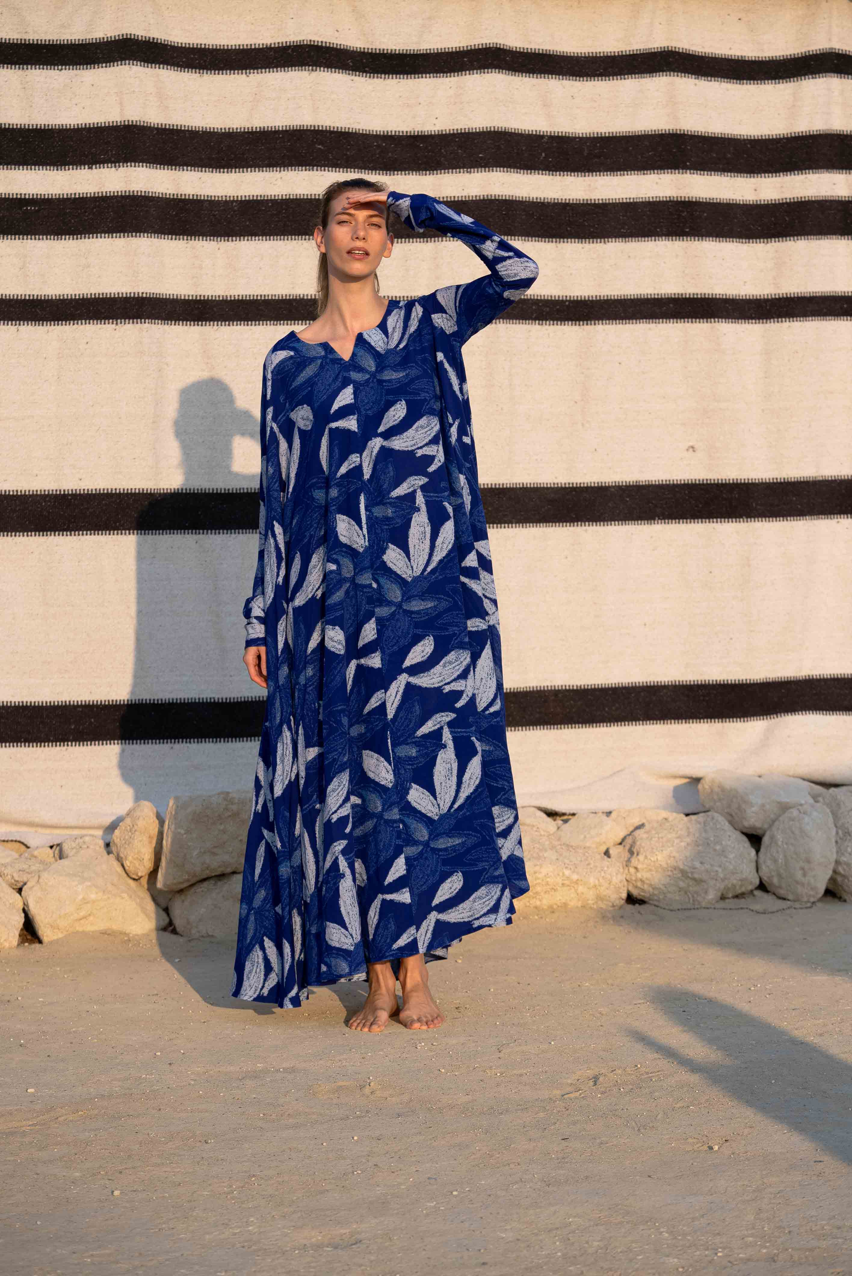 • المميزات: تصميم أنيق بطبعة زهور زرقاء مع أكمام طويلة، وقصة فضفاضة وجذابة