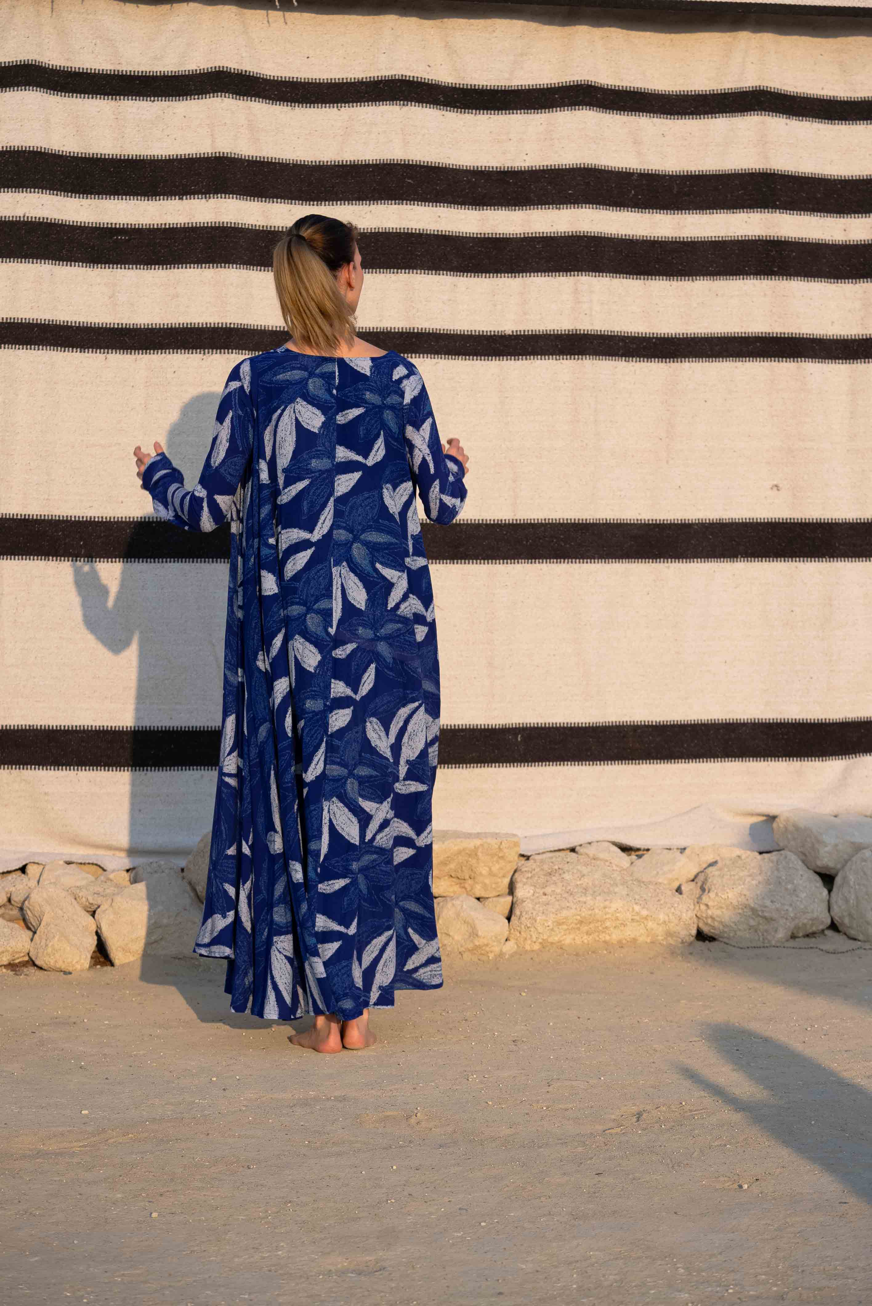قفطان بأكمام طويلة - مزيج من القطن والحرير، مقاسات من S إلى XL، بنقشة زهور زرقاء