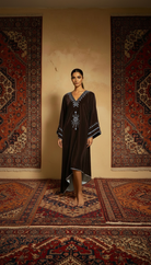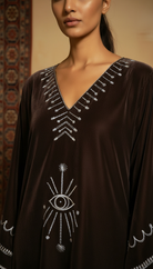 استمتعي بأناقة الحرف اليدوية مع هذا القفطان المصنوع من الحرير المخملي باللون البني الشوكولاتي. مصنوع من مخمل حريري فاخر بنسبة 100%، يتميز هذا القفطان بتطريز معقد يدويًا على شكل "عين الحماية" على الجهة الأمامية، محاط بتفاصيل مستوحاة من السماء. الأكمام العريضة مزينة بتطريز هندسي، مما يضيف لمسة فريدة ومعاصرة للصورة الظلية التقليدية.