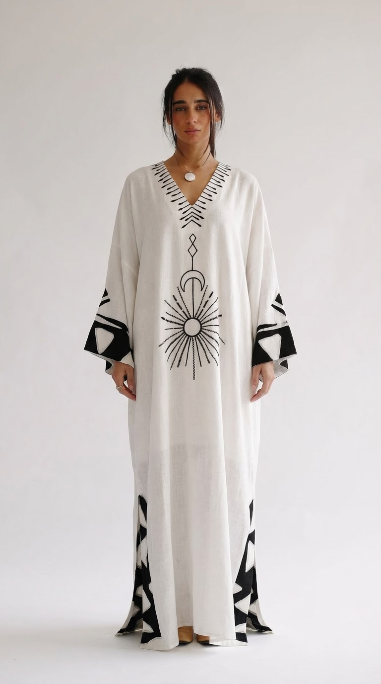 Elegant free-size linen kaftan with handcrafted embroidery. 55-inch flowing length with breathable premium fabric. Perfect for luxury everyday wear and special occasions.