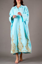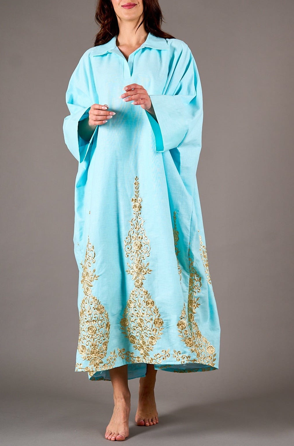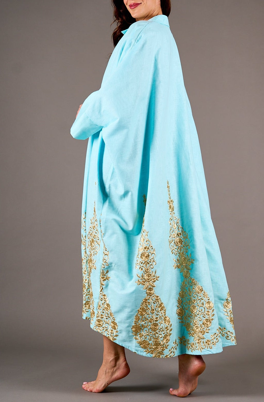 الدراعة رقم1 لينن ازرق تطريز ذهبي قياس واحد طولها 55
