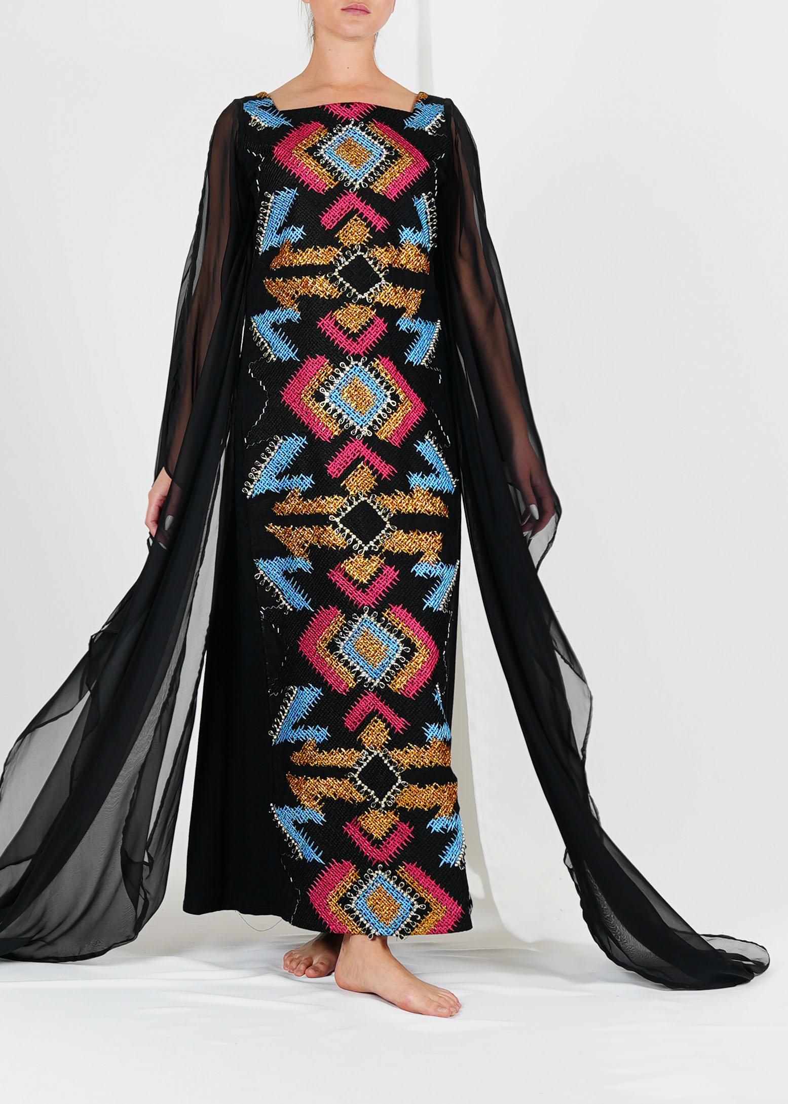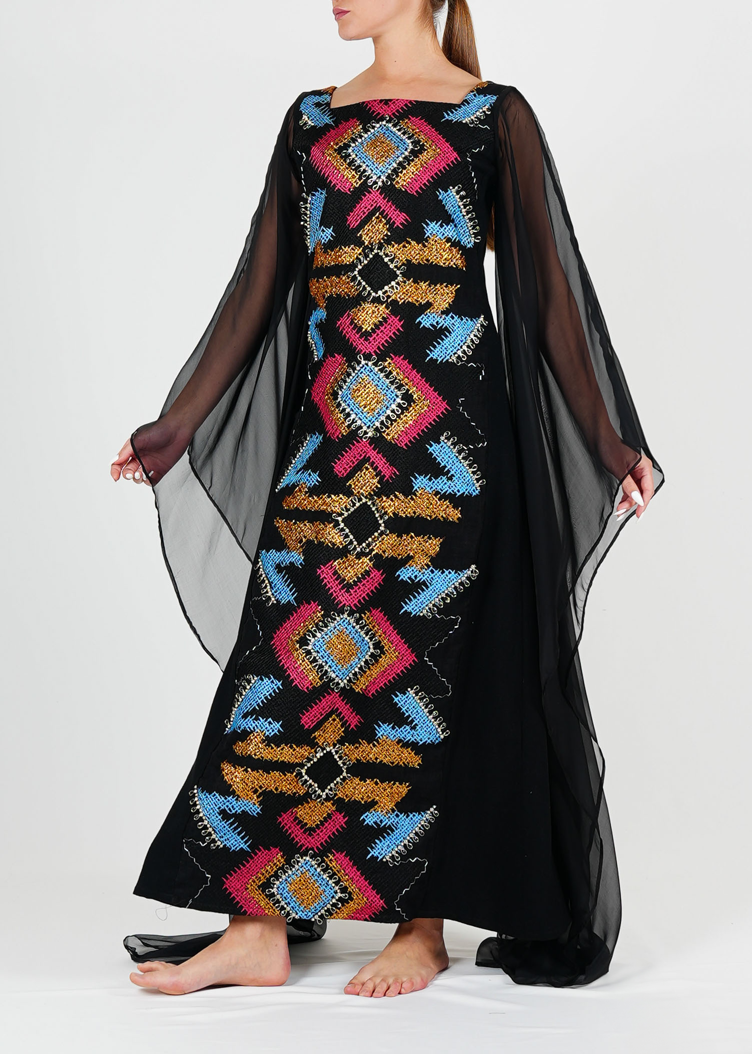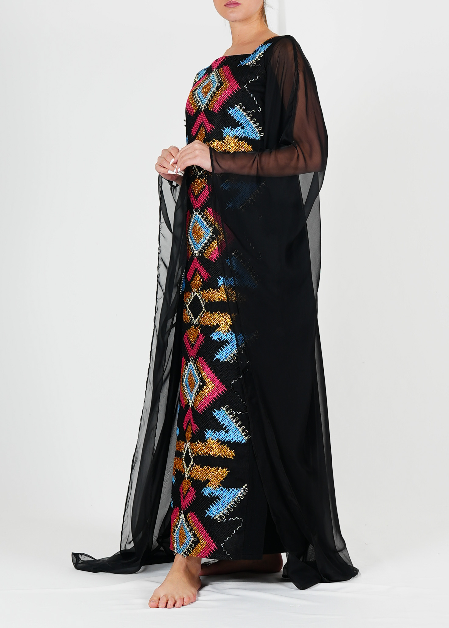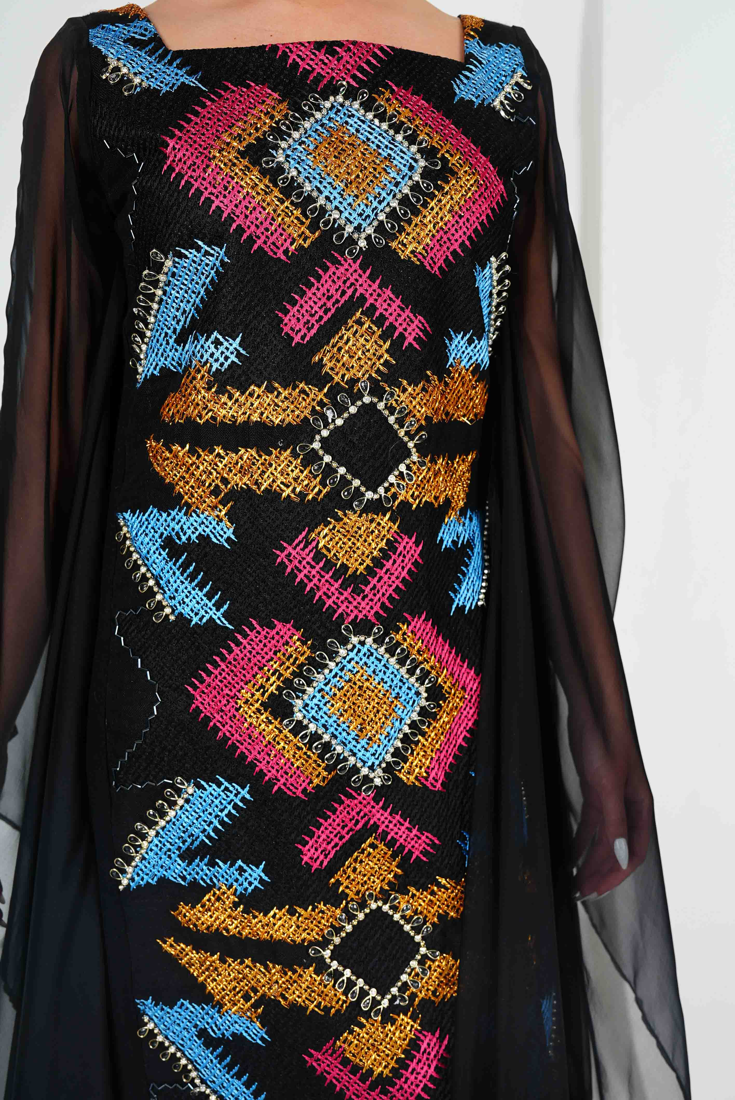 انطلقي نحو الأناقة مع قفطاننا الفاخر المصنوع من حرير الشيفون الخالص، والذي يتميز بتطريزات معقدة من الكتان بأنماط هندسية نابضة بالحياة. تجمع هذه القطعة المصنوعة حسب الطلب بين الرقي الخالد والفن الحديث، وهي مثالية للمناسبات الخاصة أو التجمعات غير الرسمية. مصمم للراحة والأناقة، هذا القفطان ينضح بالرشاقة والأناقة مع كل خطوة.