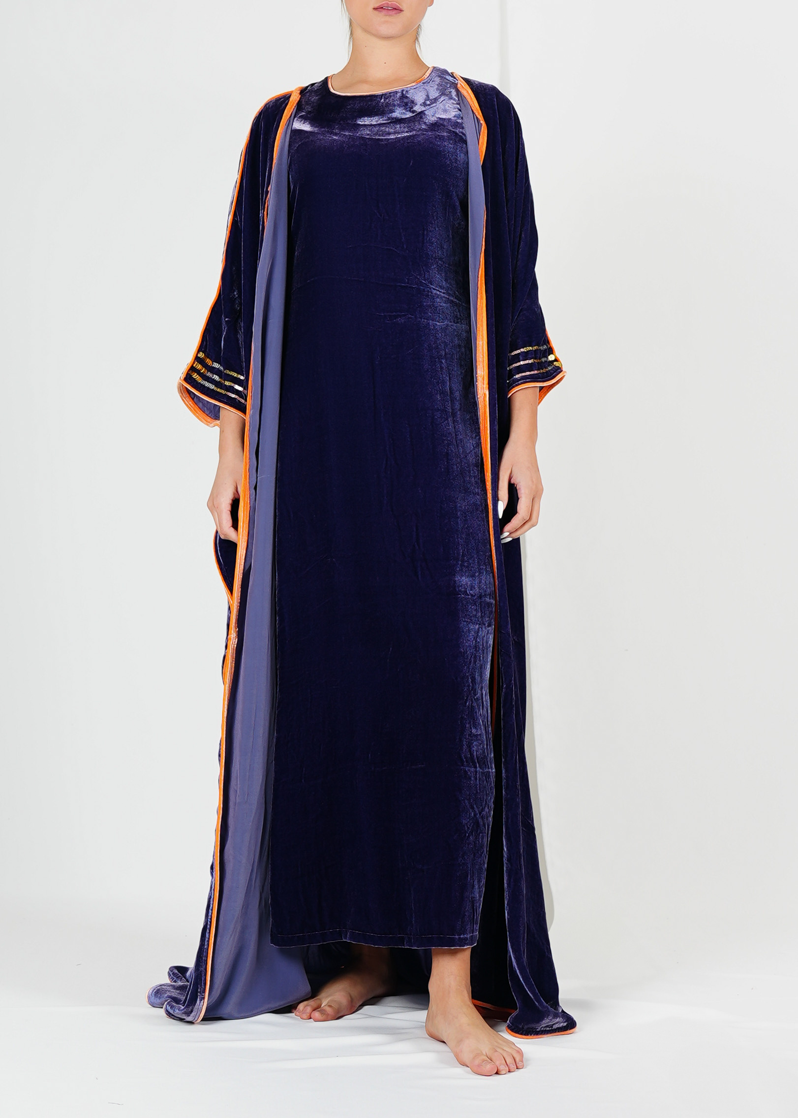 استمتعي بفخامة قفطاننا المخملي الحريري باللون الأزرق الداكن، المصنوع من مخمل حريري خالص بنسبة 100% لإضفاء لمسة ملكية وأنيقة. تتميز هذه التحفة الفنية بتطريزات الترتر المعقدة والمطبقة يدويًا والتي تشكل نقشًا مشعًا لأشعة الشمس على الظهر، ومصممة بعناية لترمز إلى التألق والفردية. تضيف الحواف البرتقالية والذهبية النابضة بالحياة لمسة معاصرة إلى سحرها الكلاسيكي.