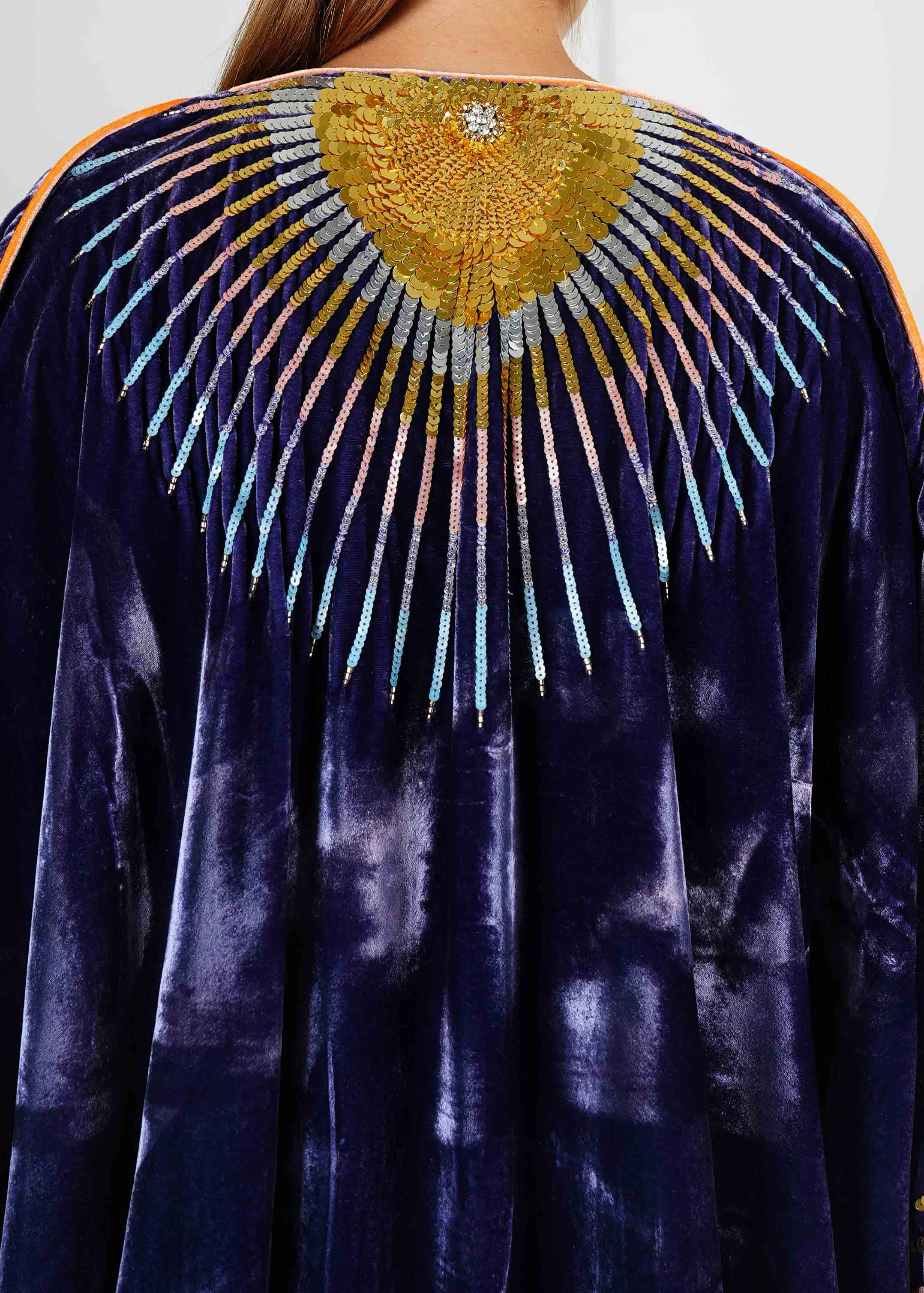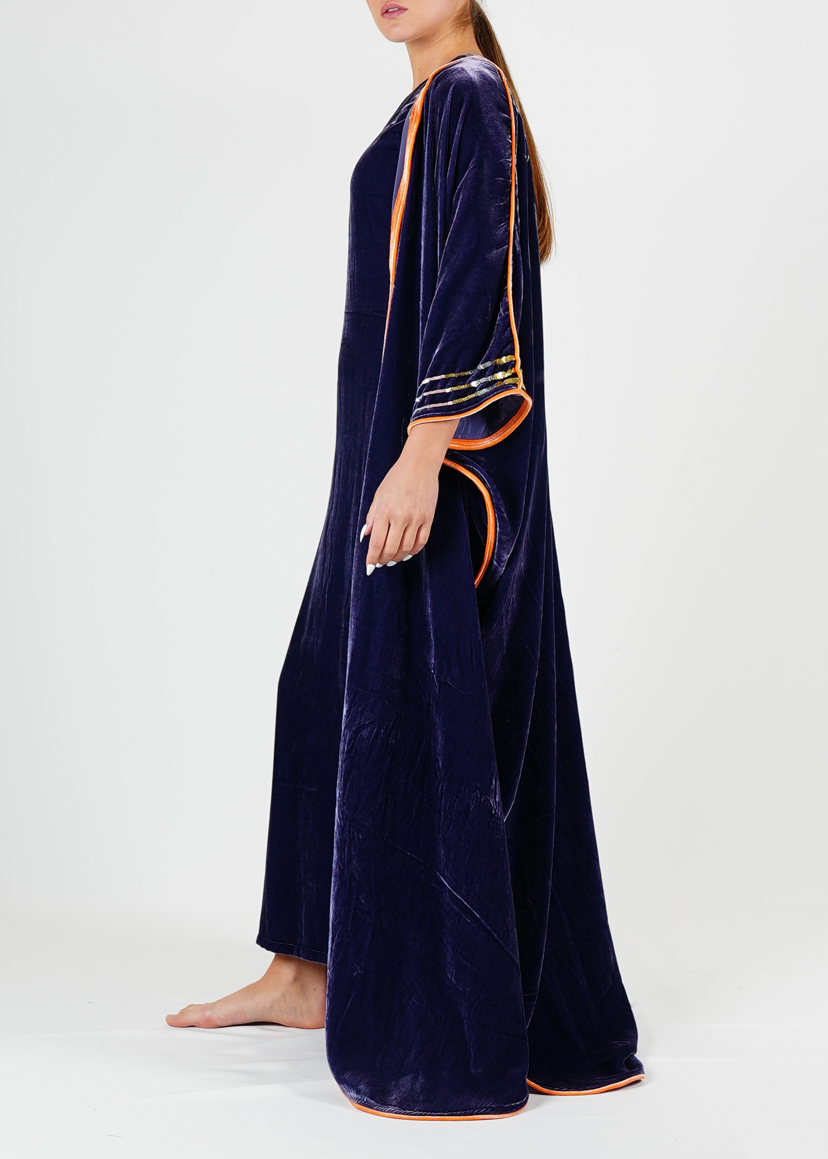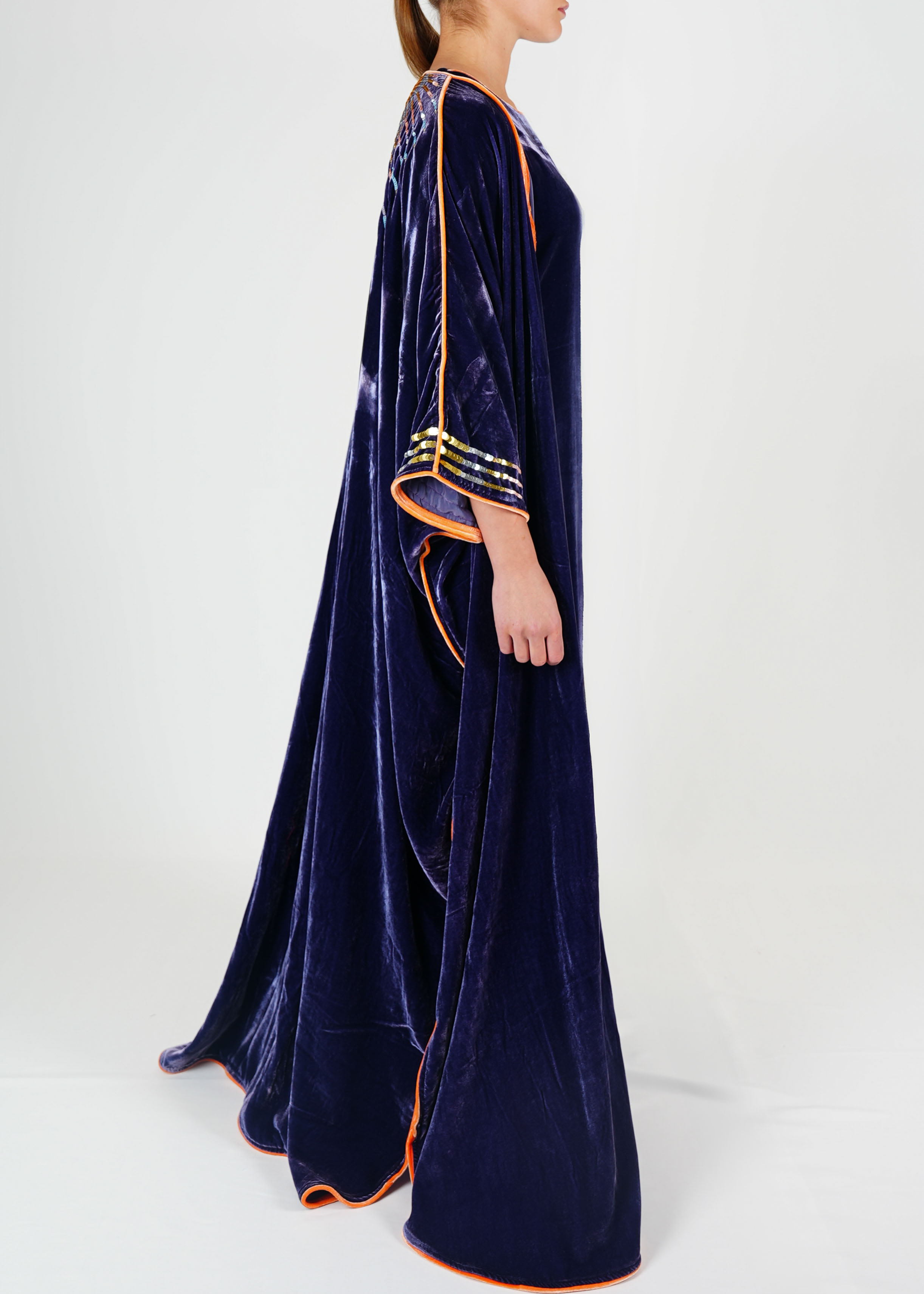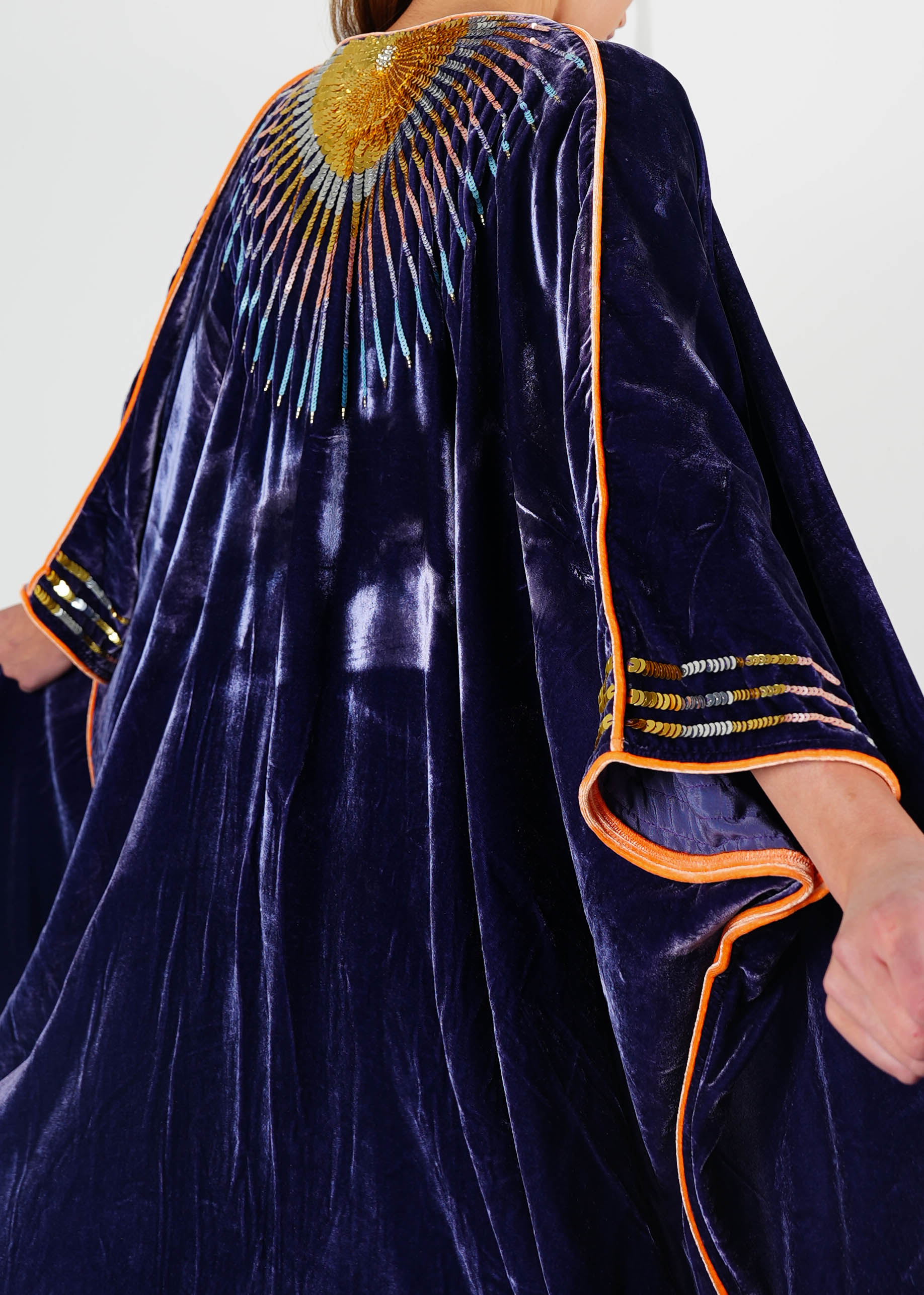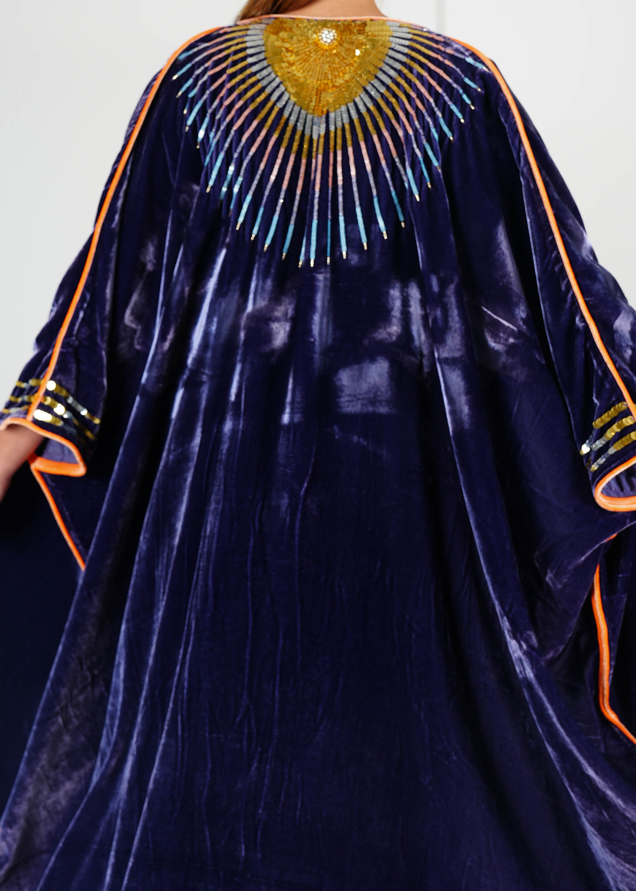 قفطان كوتور مصمم حسب الطلب حصريًا: قفطان مخملي من الحرير باللون الأزرق الداكن مع ترتر صن بيرست المصنوع يدويًا