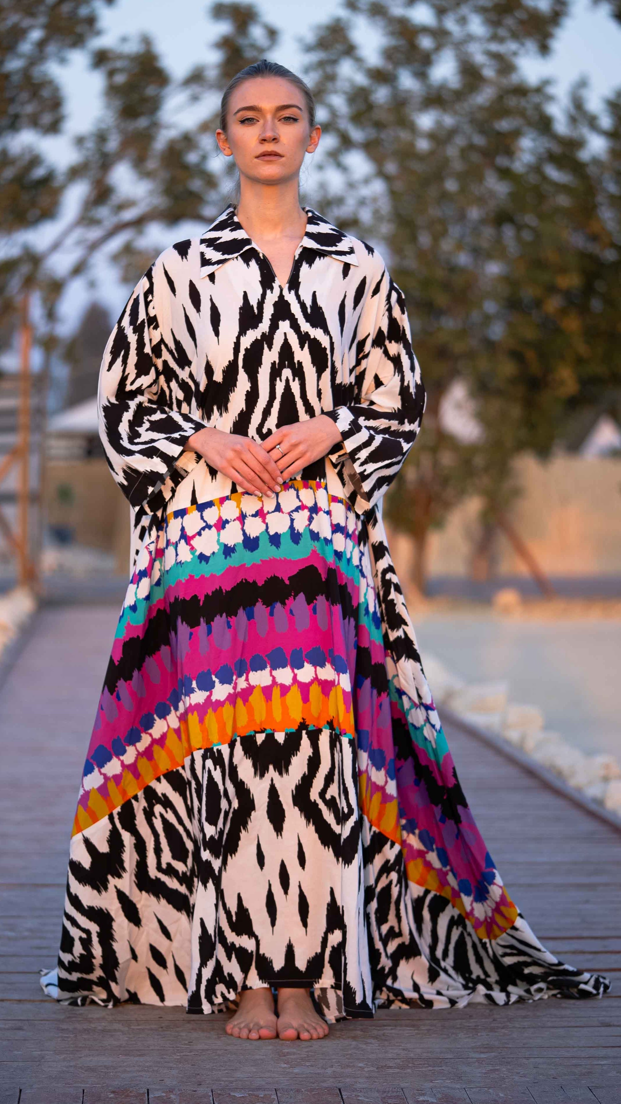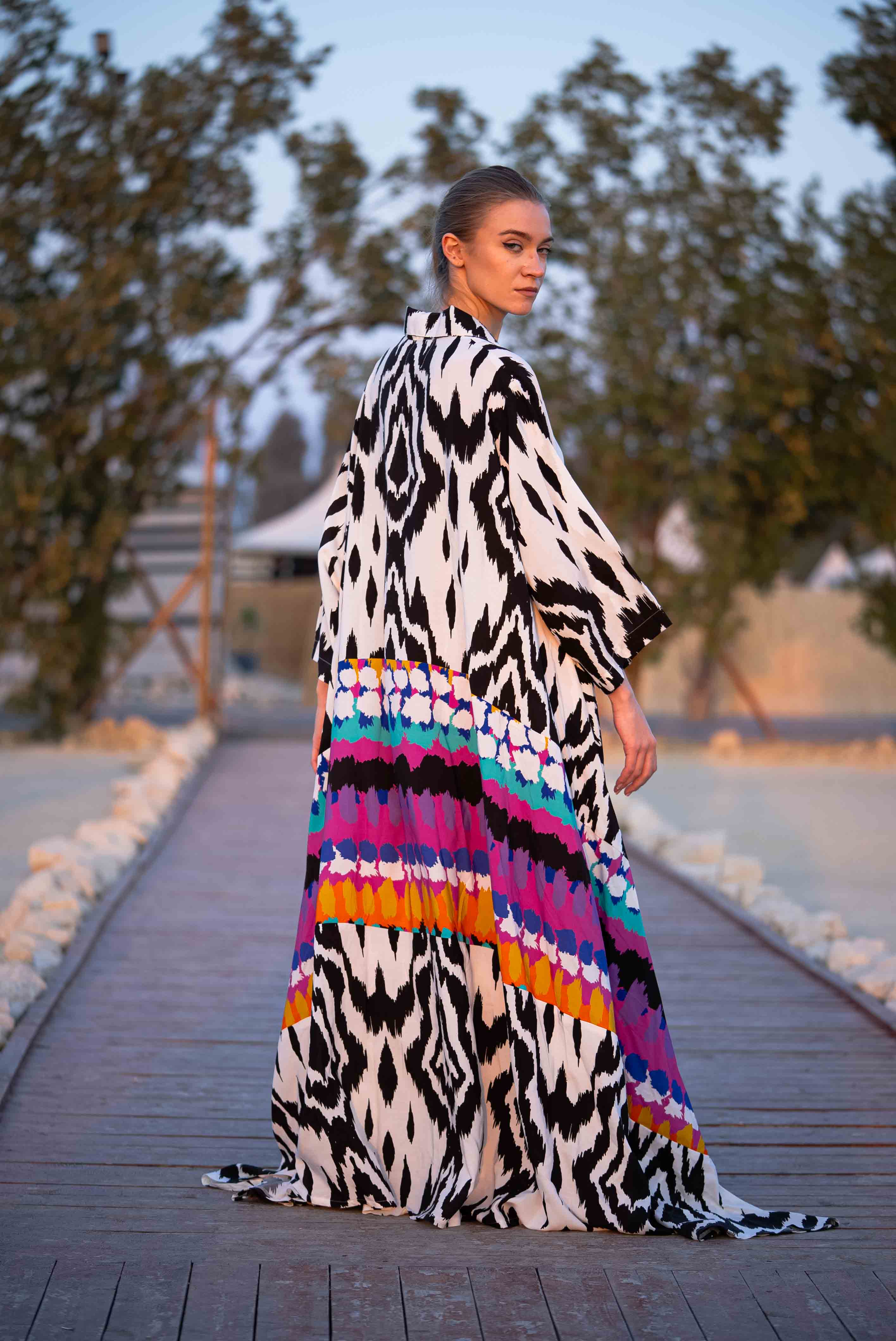 Embrace elegance with the Mirage Kaftan, a free-size design that blends bold black-and-white Ikat patterns with vibrant multicolor stripes. Its unique design creates a striking look, perfect for any occasion—from casual daytime outings to evening gatherings. Made from lightweight, breathable fabric, this 55-inch kaftan offers a flowy and flattering fit that feels cool and comfortable on the skin.