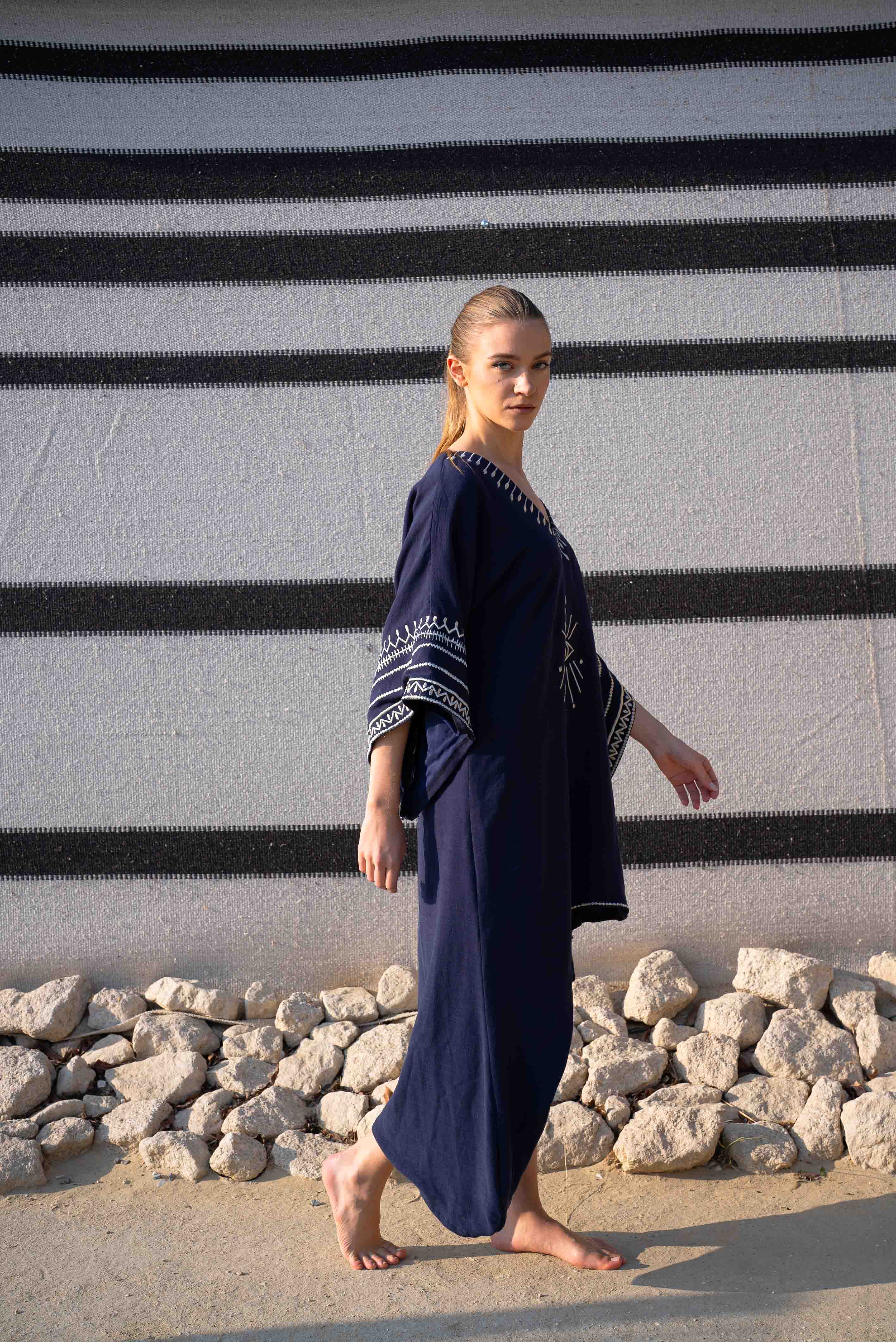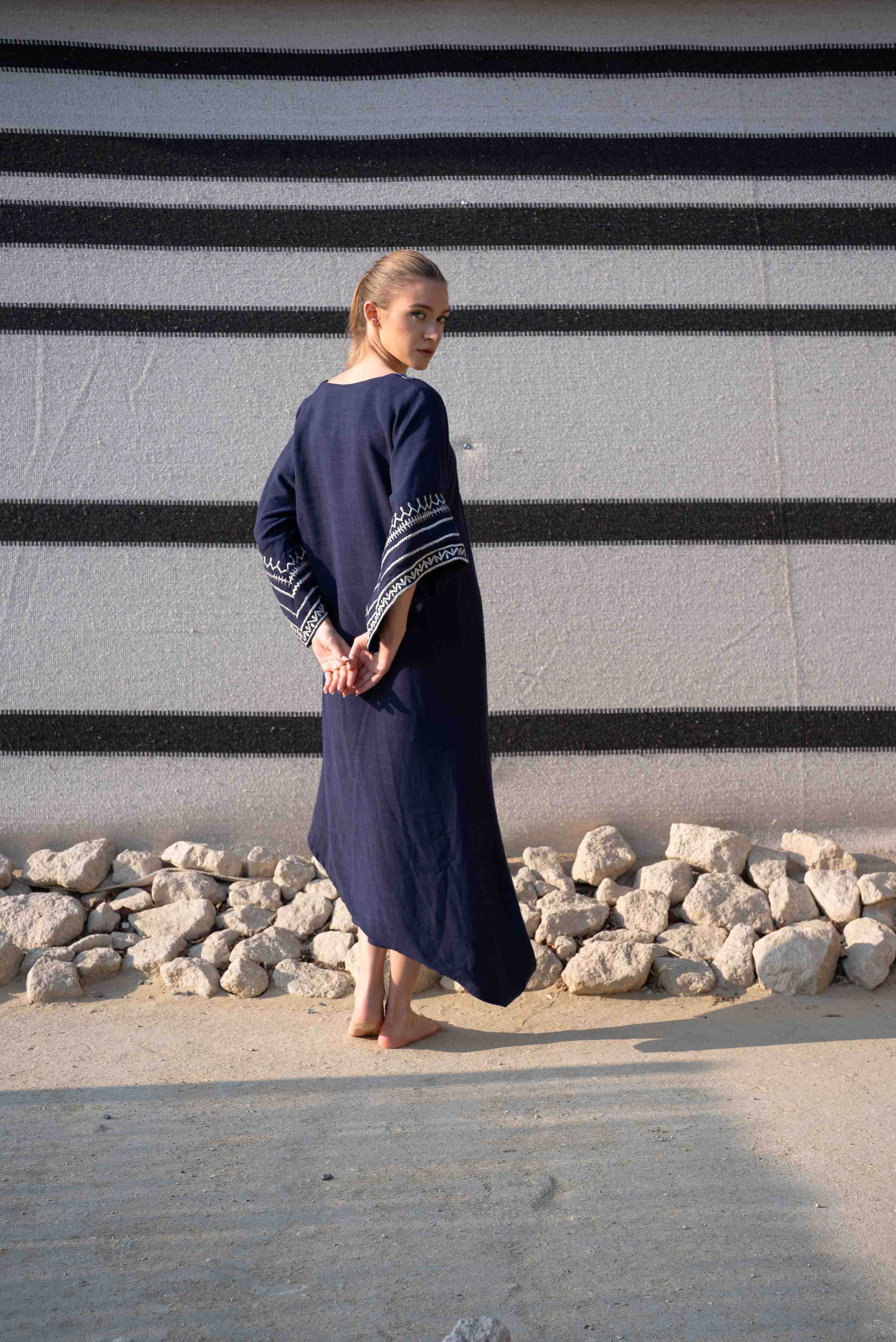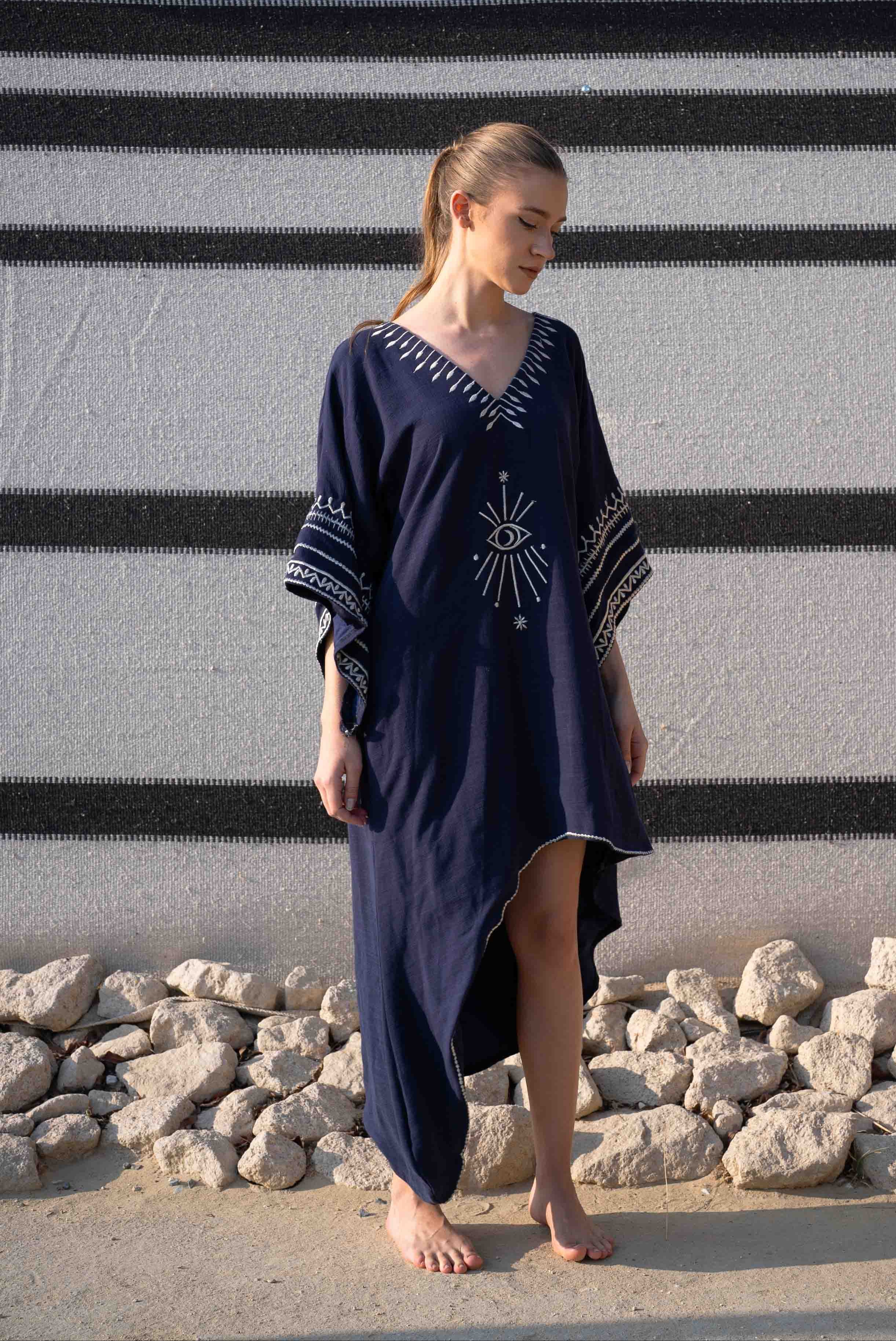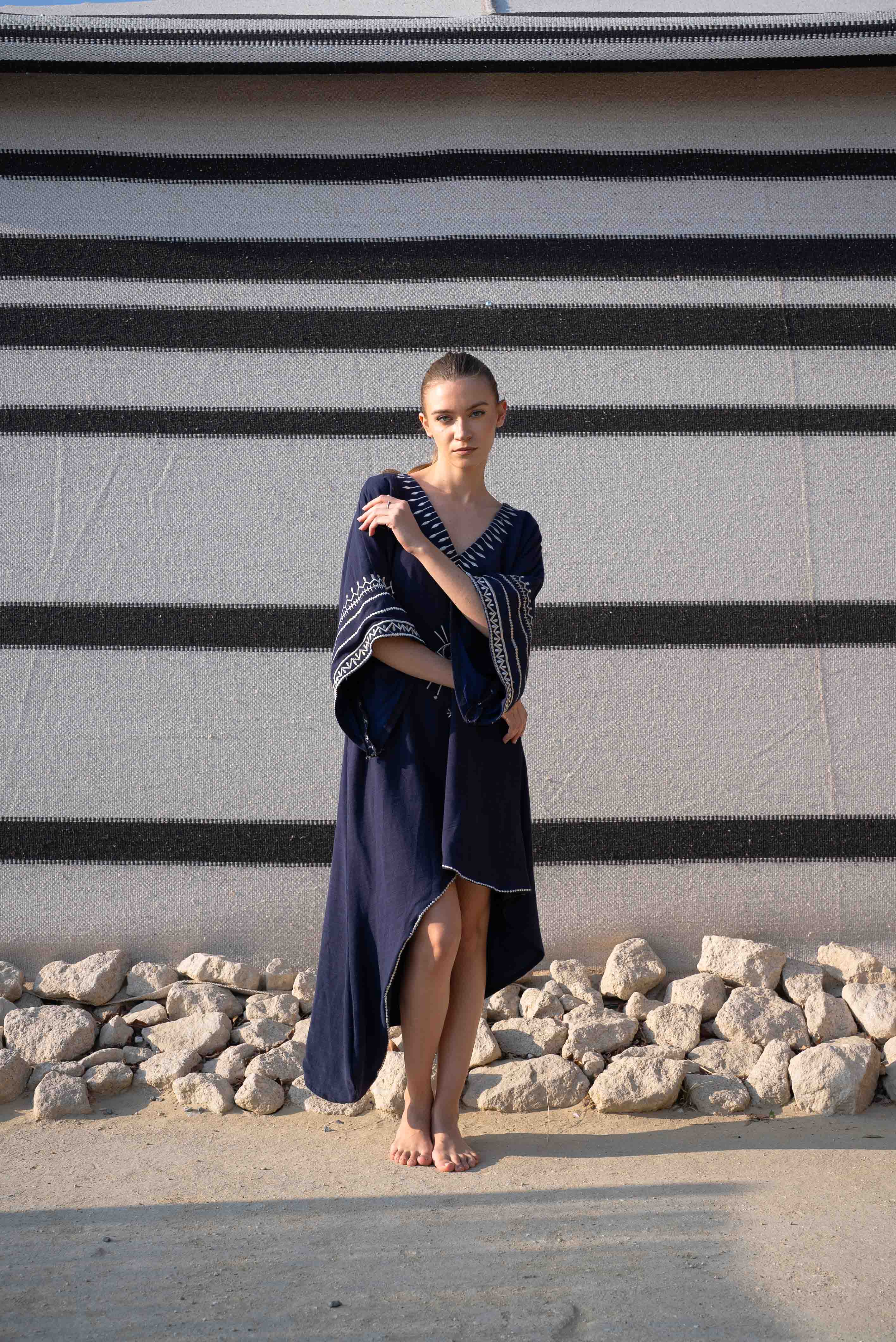 The long side is 55 inches the shorter side 40 inches, Customize the kaftan to your preference—please provide us with your required length for the perfect fit.
