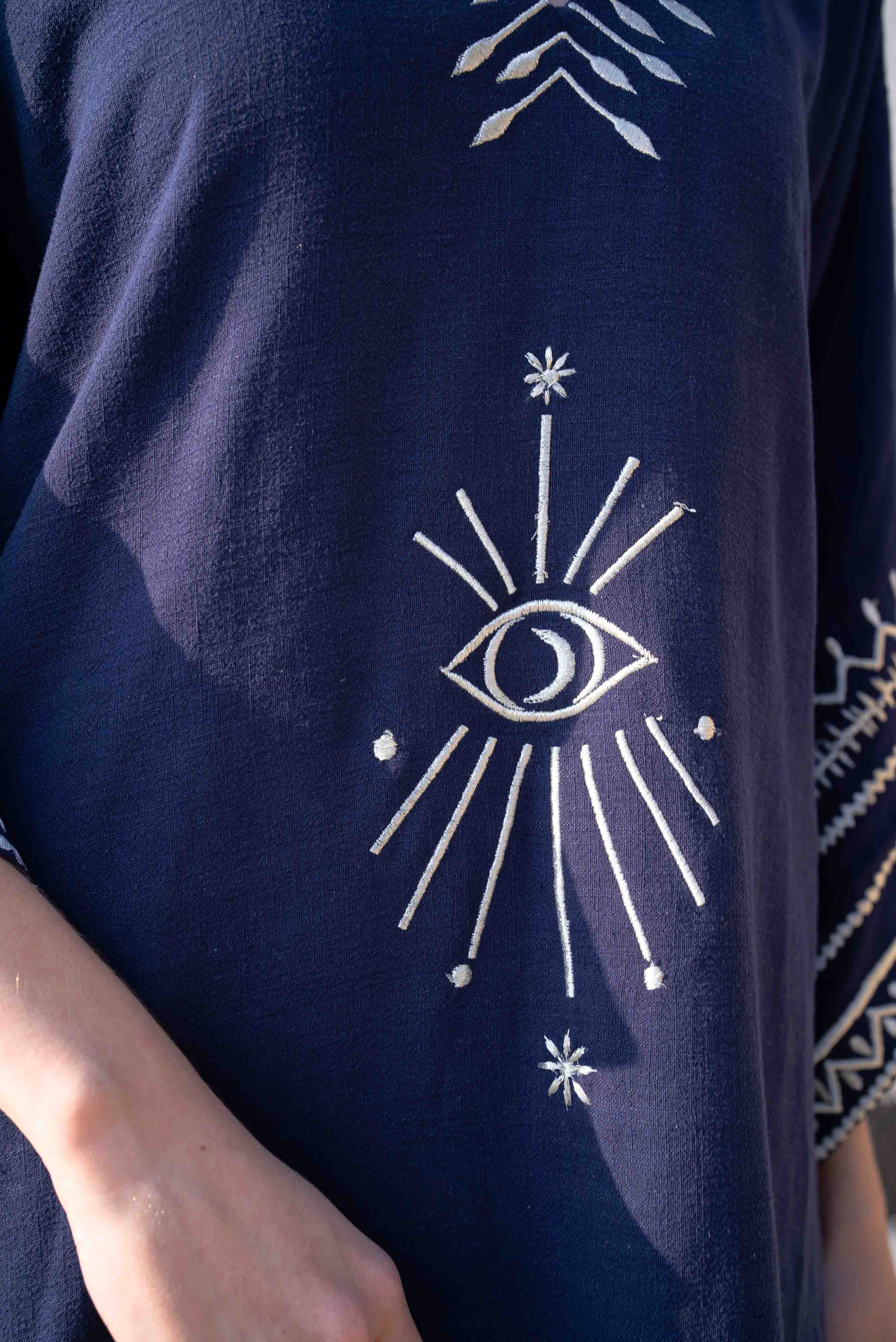- Intricate gold embroidery featuring an eye motif with radiating sun rays.