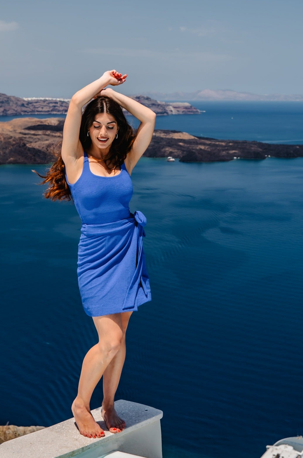بدلة سباحة من قطعة واحدة باللون الأزرق سانتوريني – نسيج محكم لراحة أنيقة مع تنورة قصيرة ووسادات