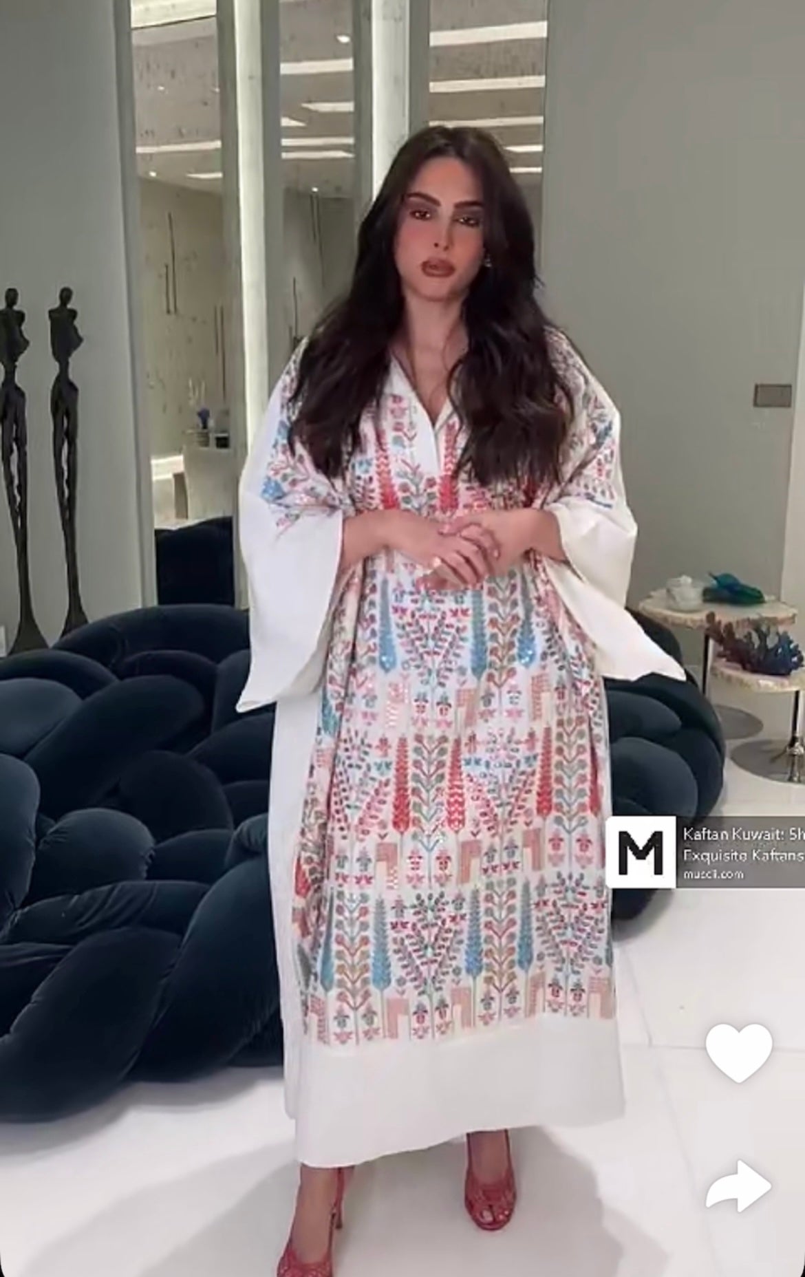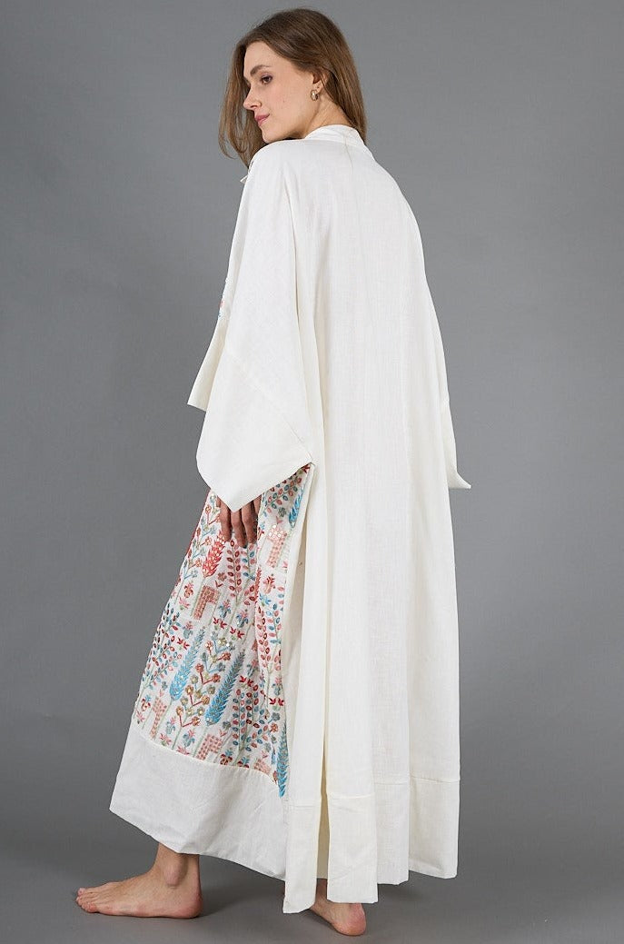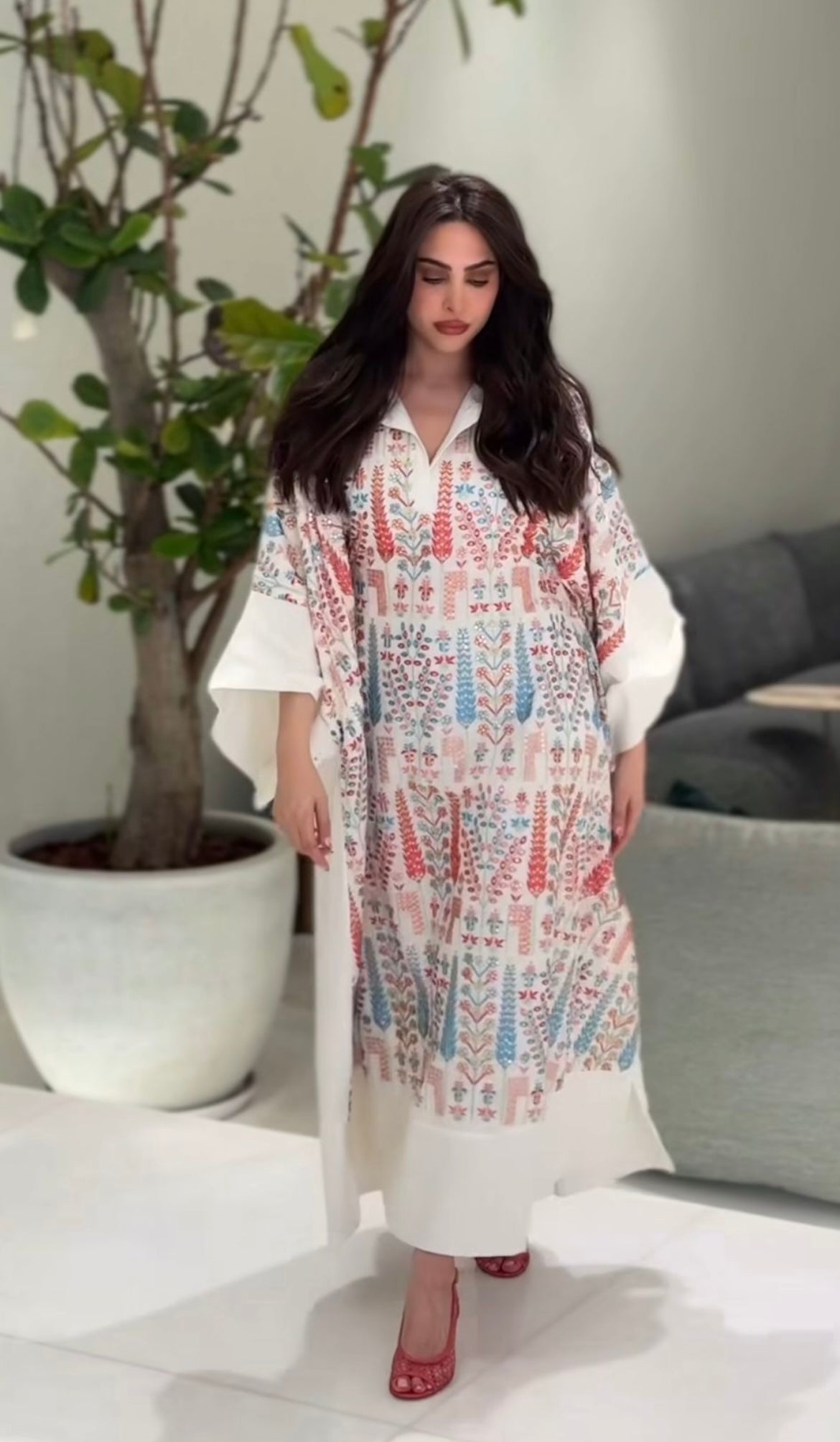 قفطان أبيض مع تطريز ملون وحزام داخلي مبطن