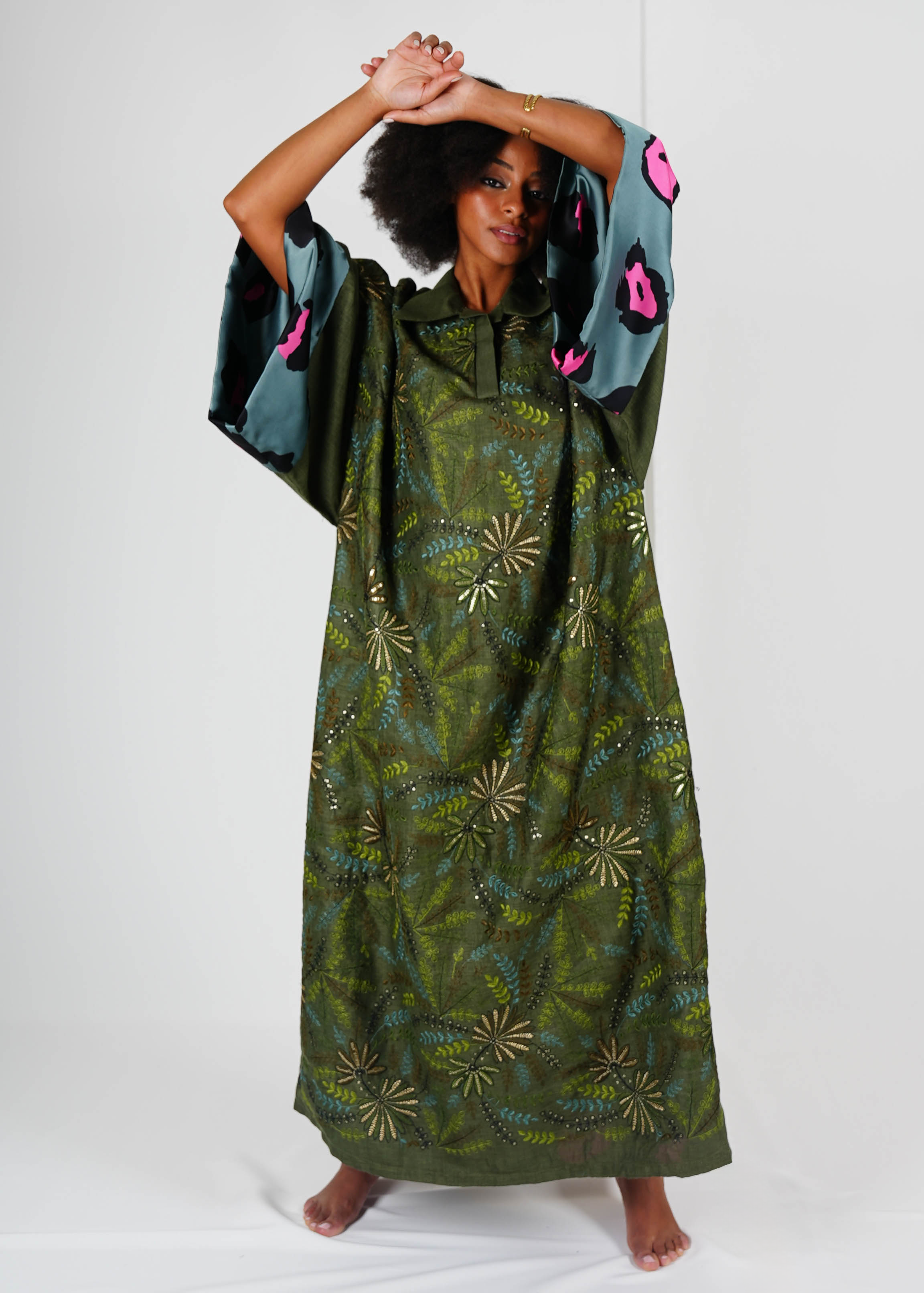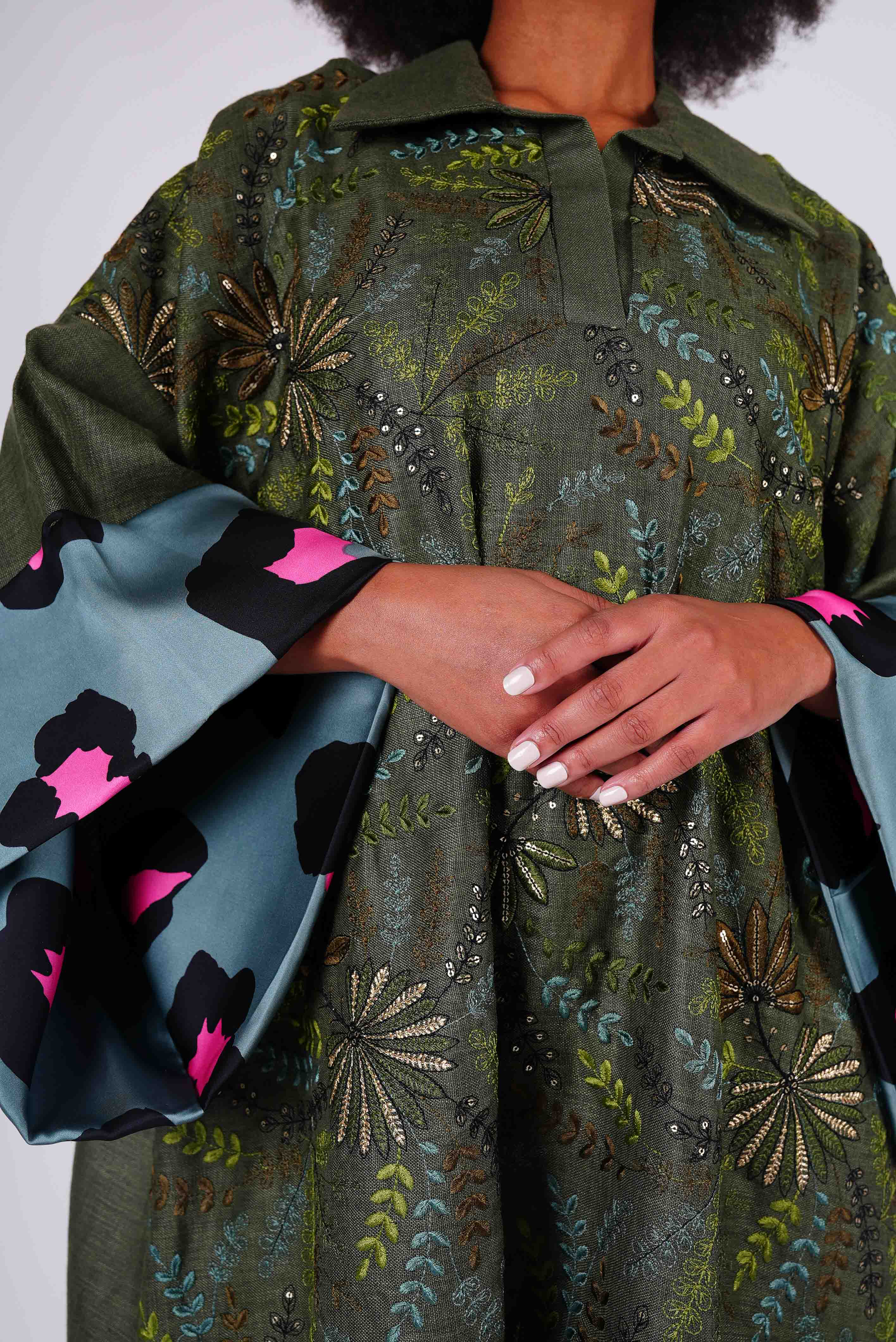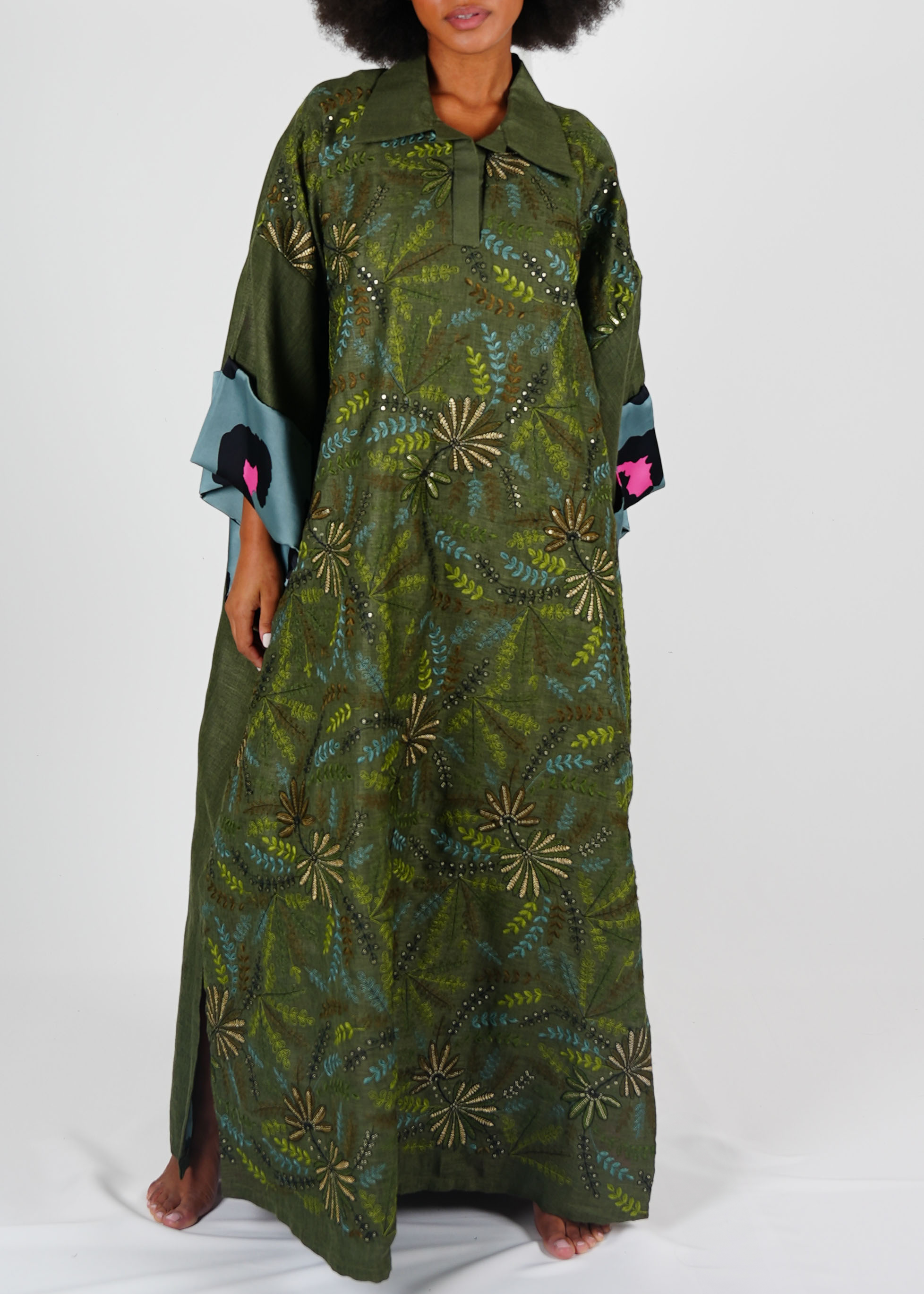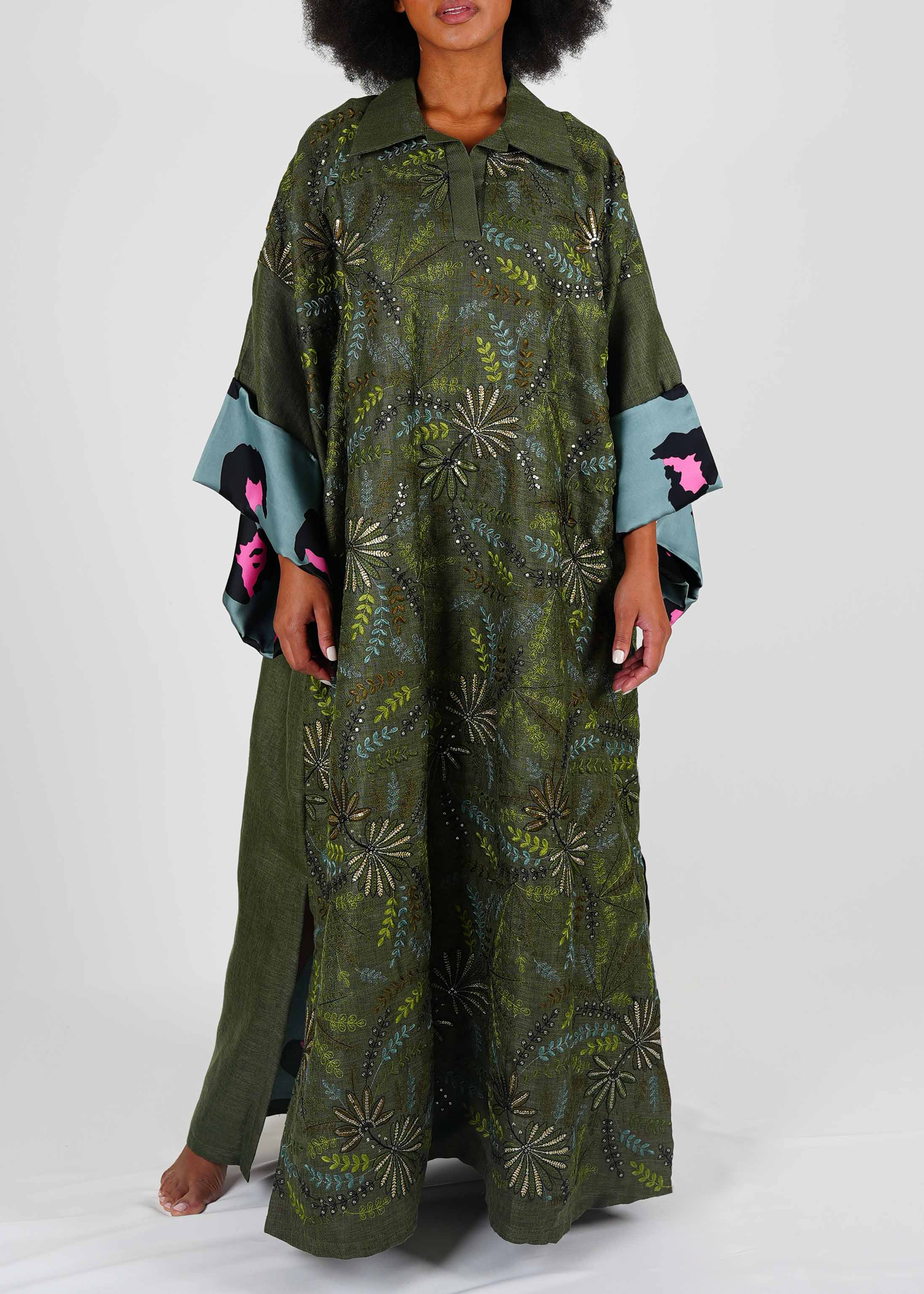 Celebrate elegance with this green linen kaftan featuring delicate floral embroidery and artistic sleeves with bold patterns. The 55-inch length and one-size design provide a comfortable fit for all, making it perfect for any special occasion. Crafted from premium breathable fabric, this kaftan is as stylish as it is versatile.
