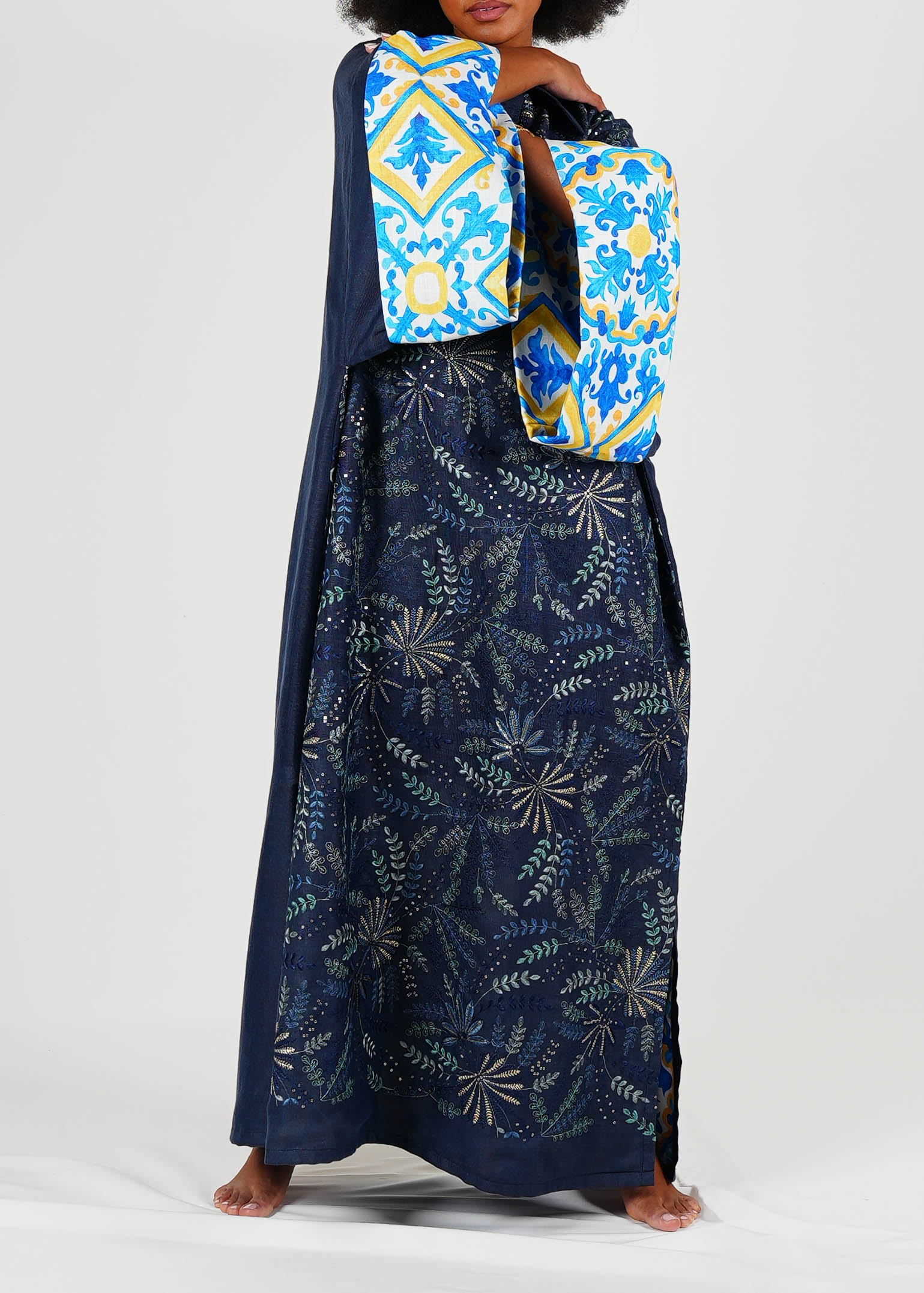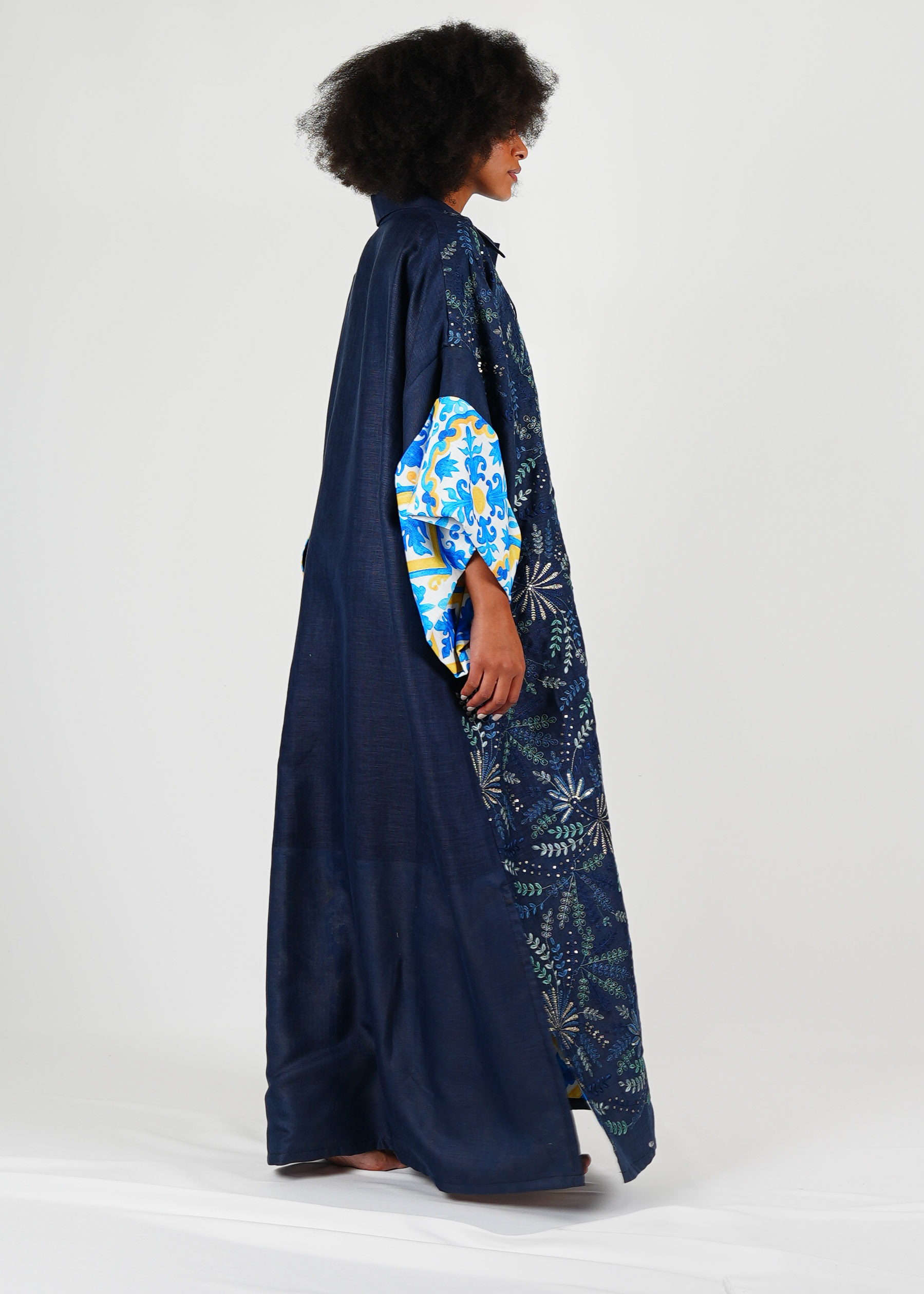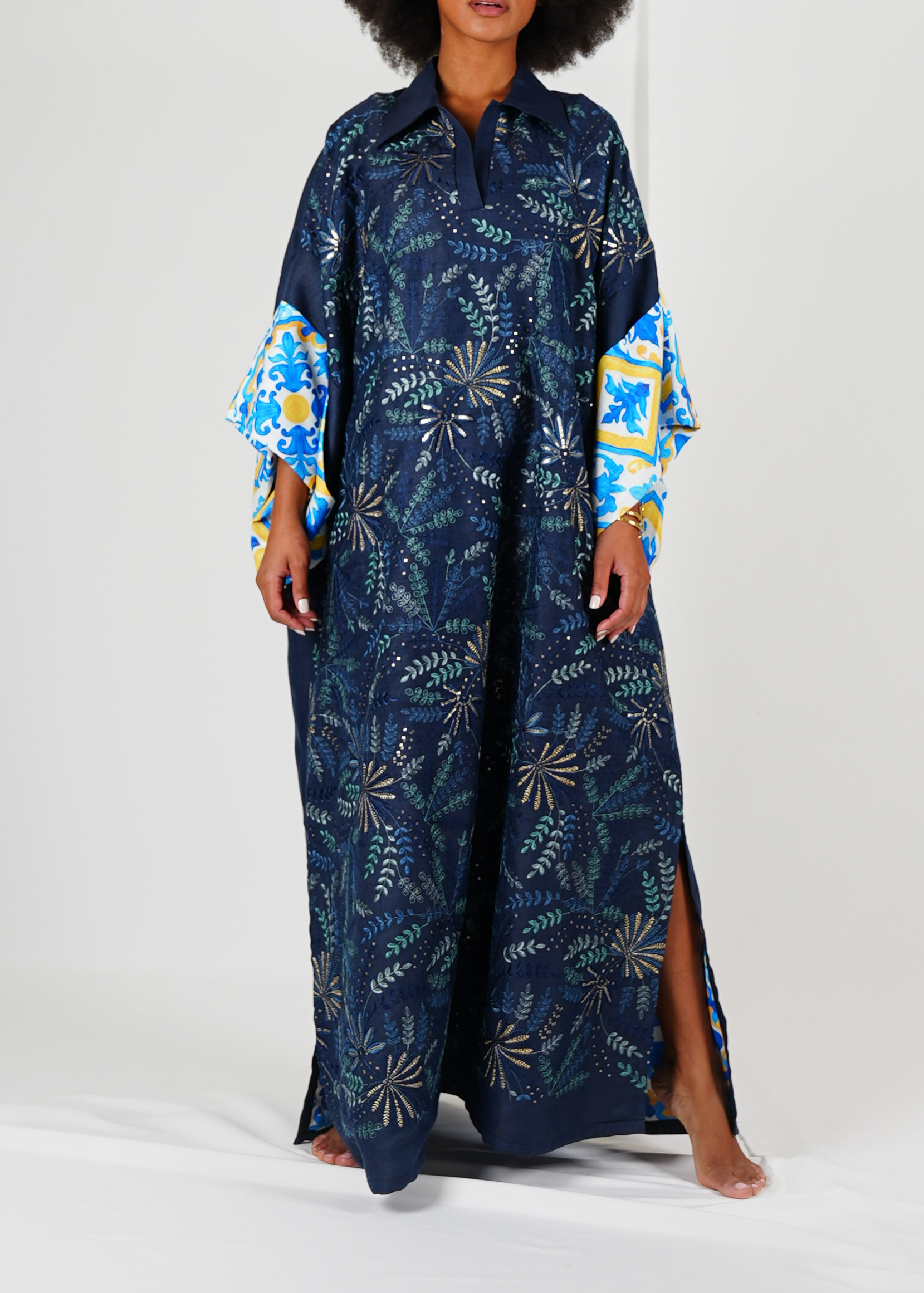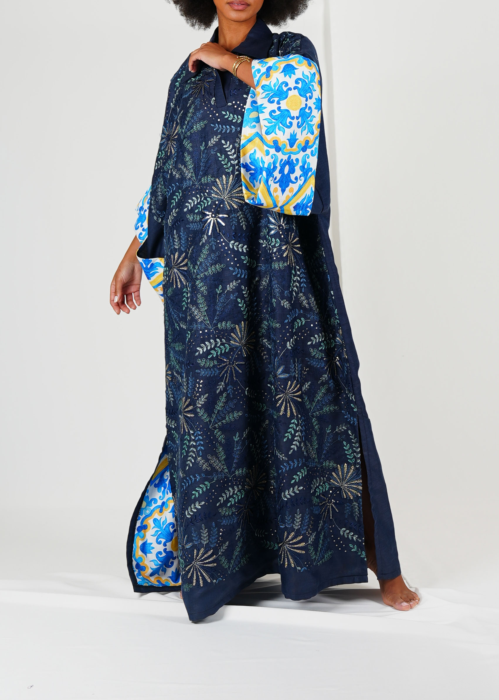 Navy Blue Embroidered Kaftan with Contrast Sleeves - Free Size