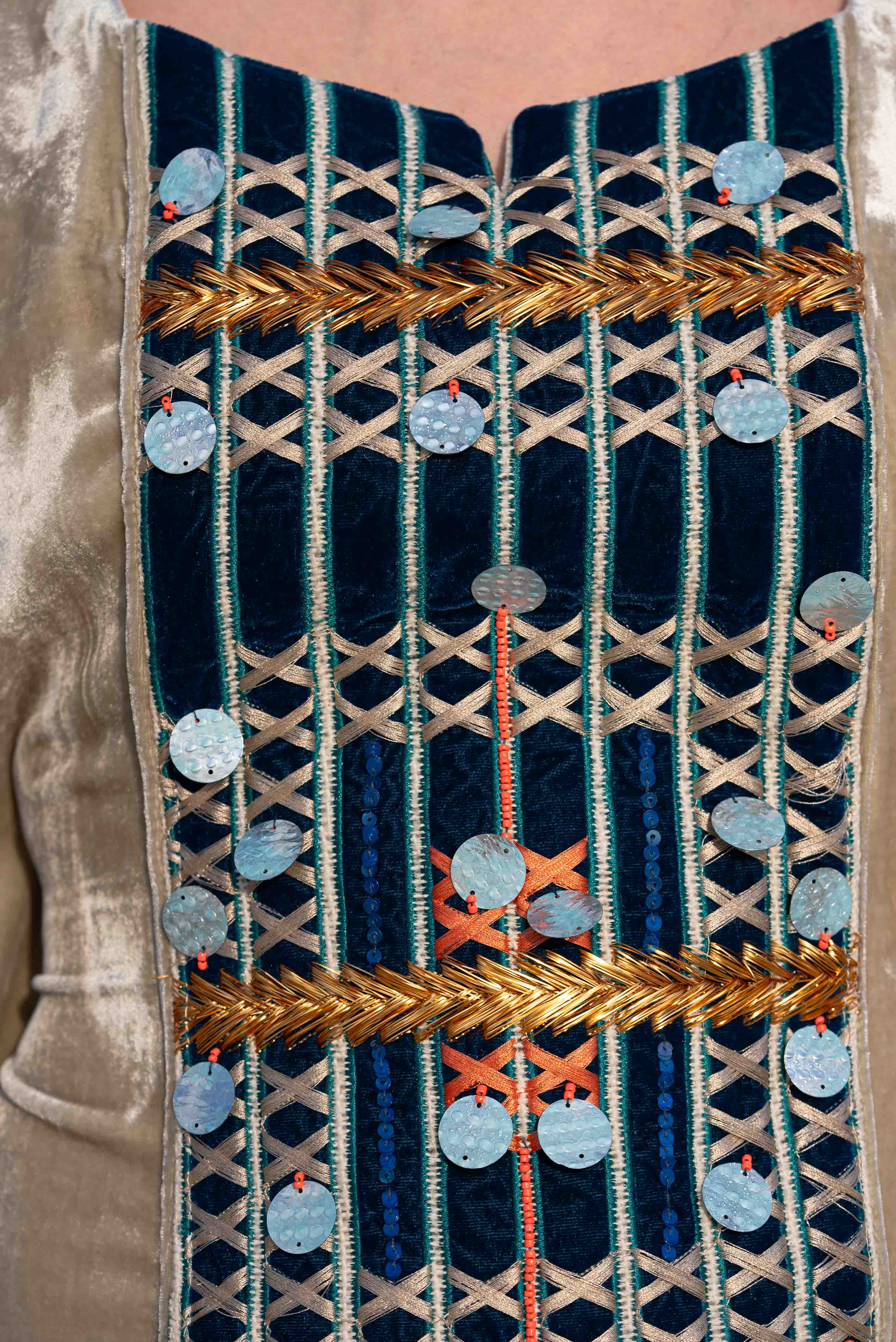 - Bodice: Hand-embroidered with intricate geometric patterns in blue and gold, highlighted by mirror and bead embellishments.