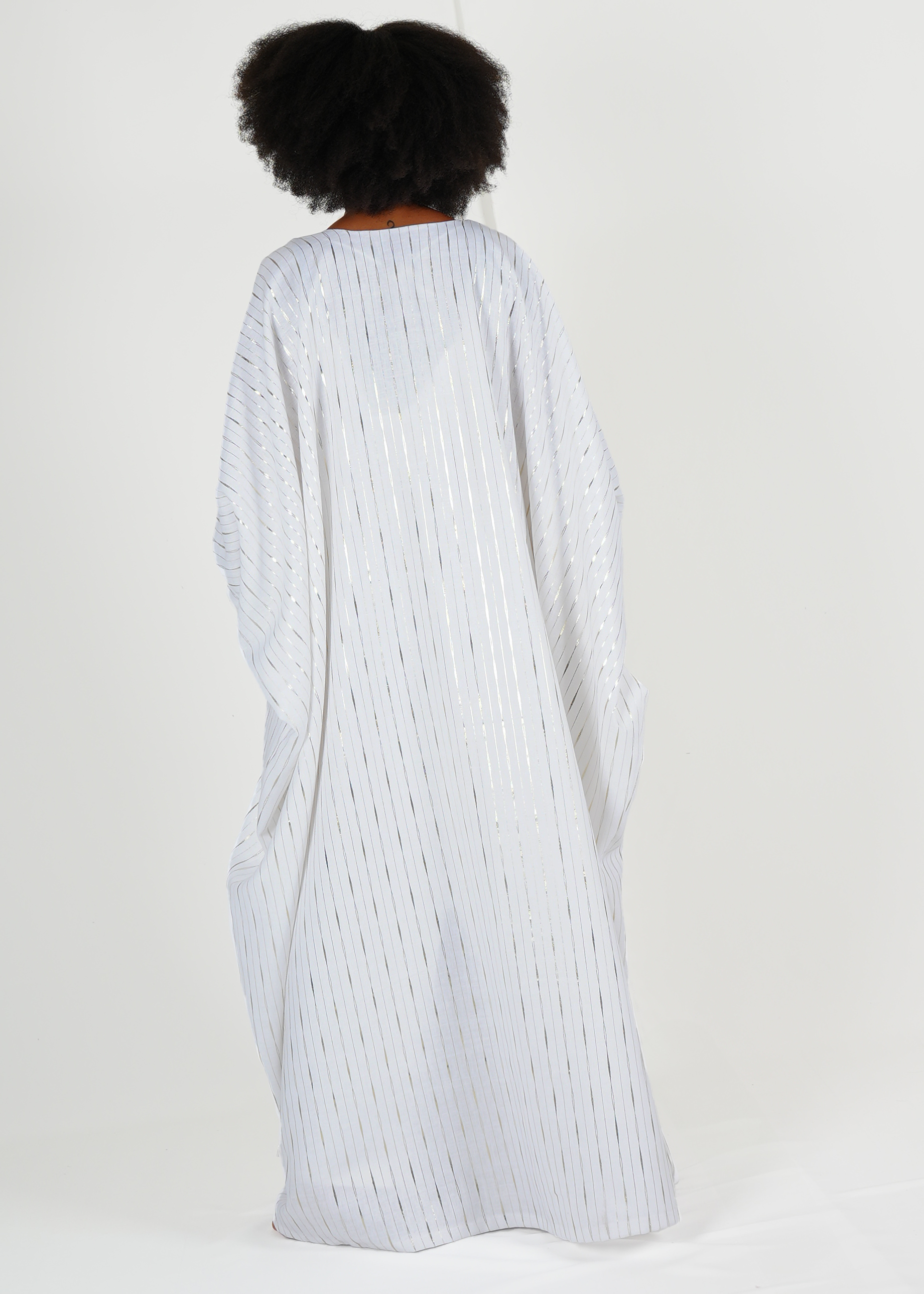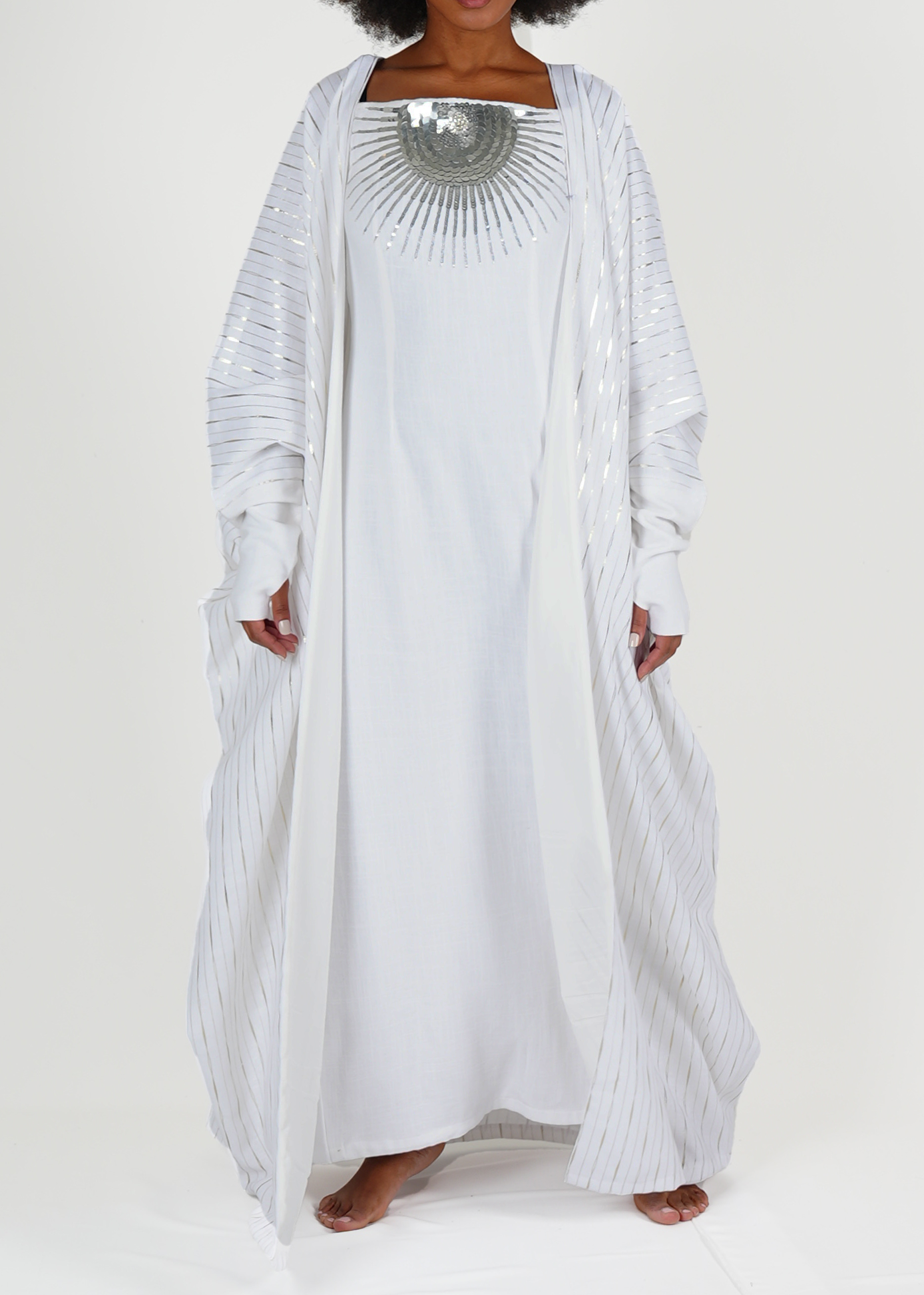 Make a sophisticated impression with this pristine white linen kaftan adorned with an exquisite silver embellishment, radiating elegance and charm. The airy and relaxed silhouette ensures all-day comfort while maintaining a refined appearance. Measuring 55 inches in length and available in UK sizes 6 to 24, this kaftan is perfect for special occasions or casual elegance. Add a touch of grace to your wardrobe with this versatile and luxurious design.