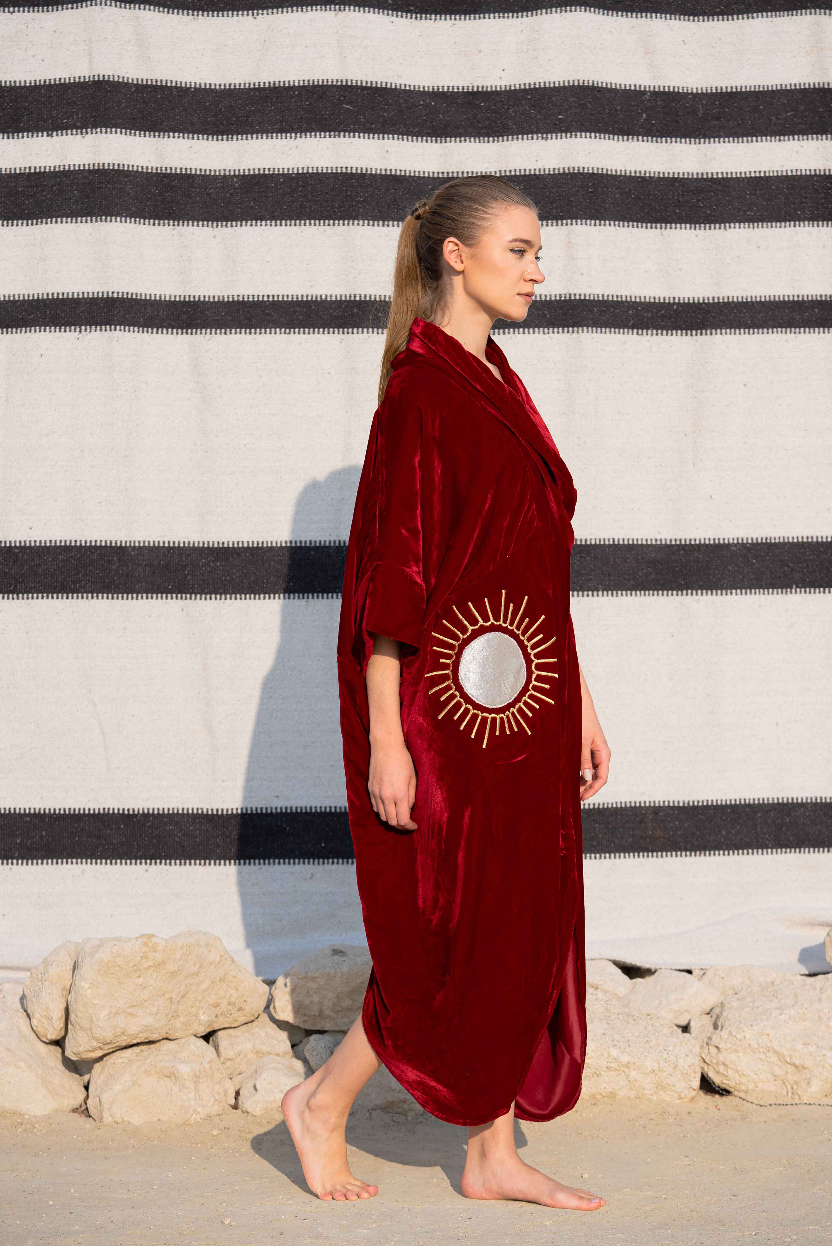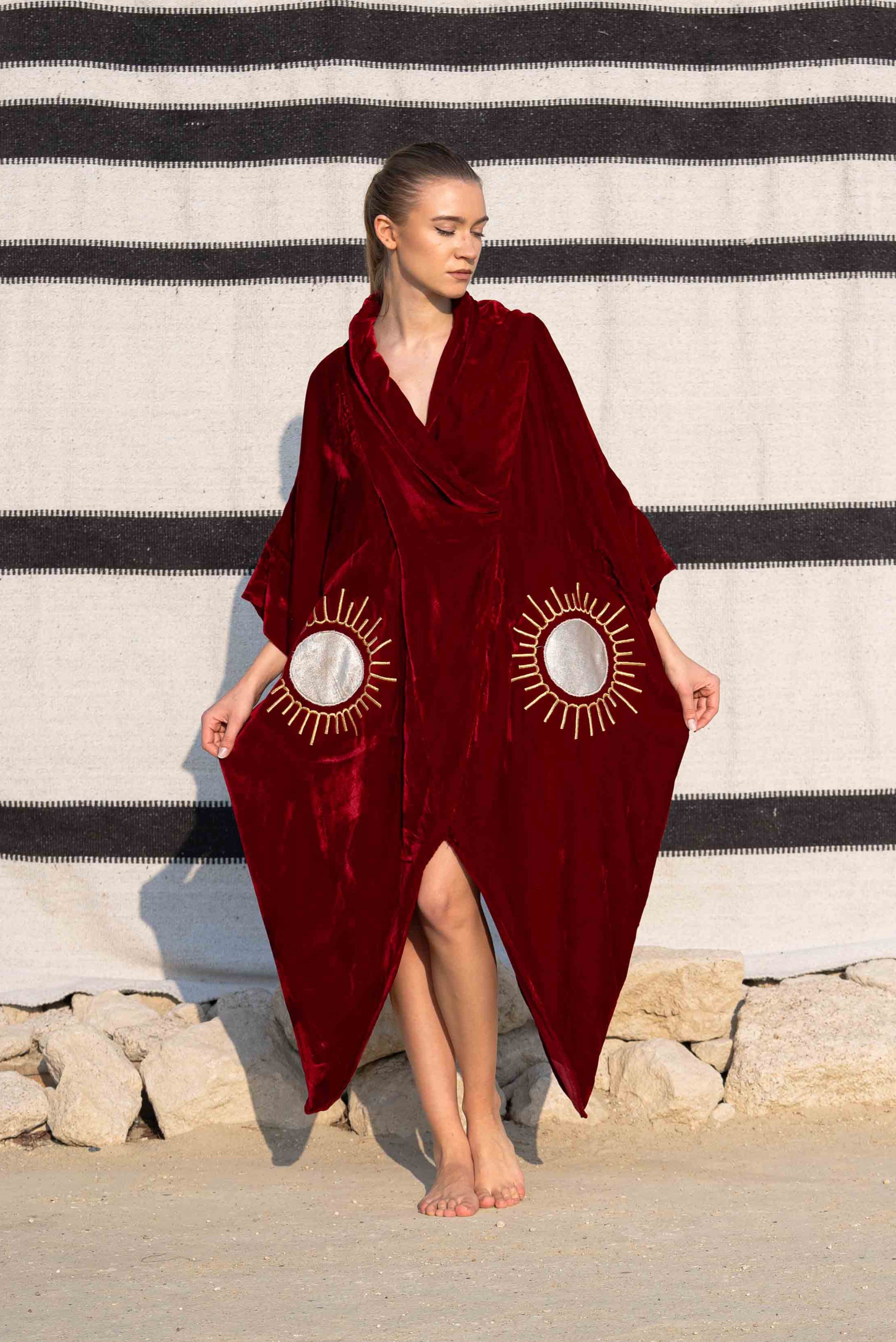 - Motifs: Hand-embroidered sun motifs with intricate beadwork and metallic accents on the front.