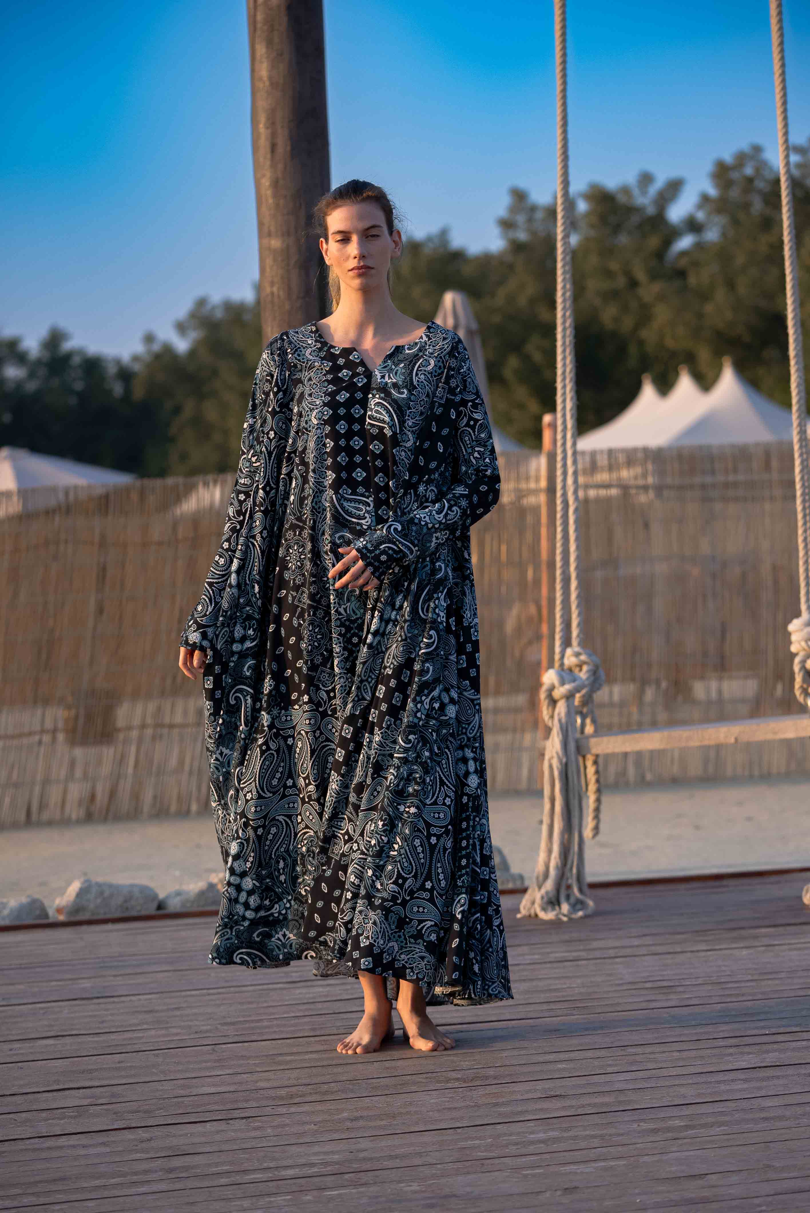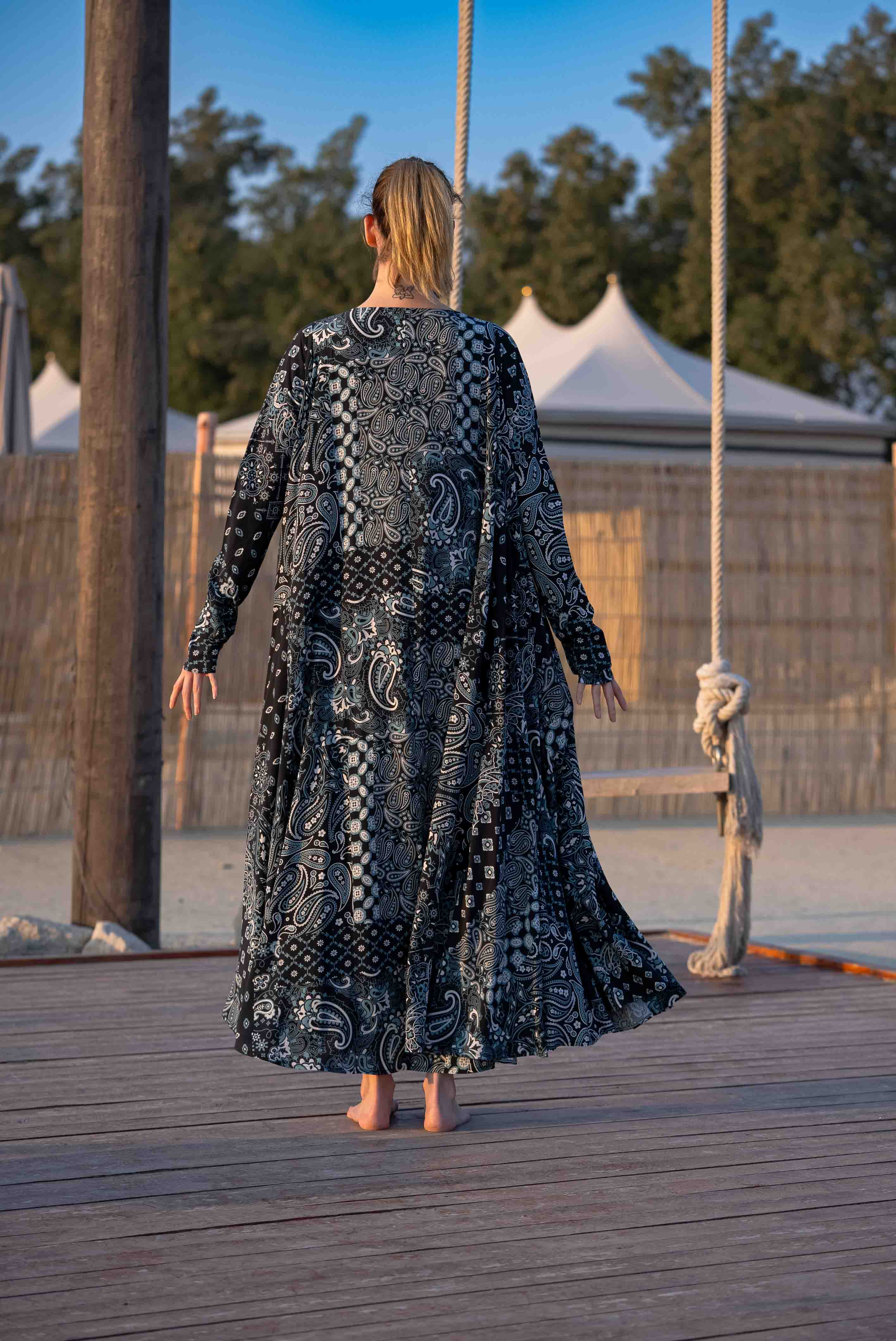 Step into elegance with the Navy Paisley Kaftan, adorned with intricate paisley patterns in shades of navy and white. Crafted from a luxurious cotton silk blend, this long-sleeve kaftan offers softness, breathability, and lightweight comfort. Its flowy silhouette is perfect for casual gatherings, evening events, or vacations. Available in sizes S, M, L, and XL to flatter every body type.