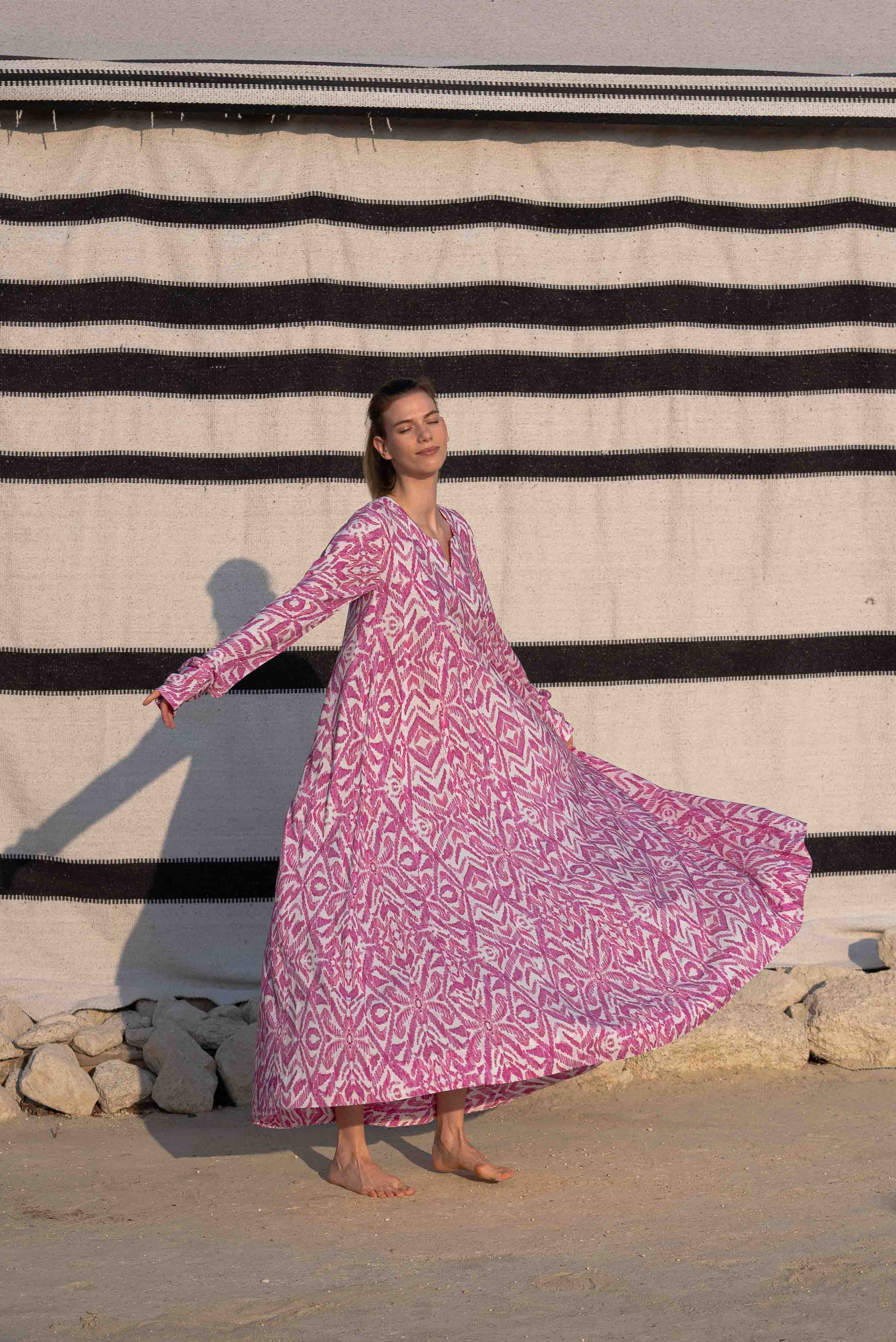 Long-Sleeve Kaftan – Cotton Silk Blend, Sizes S to XL, Pink Print