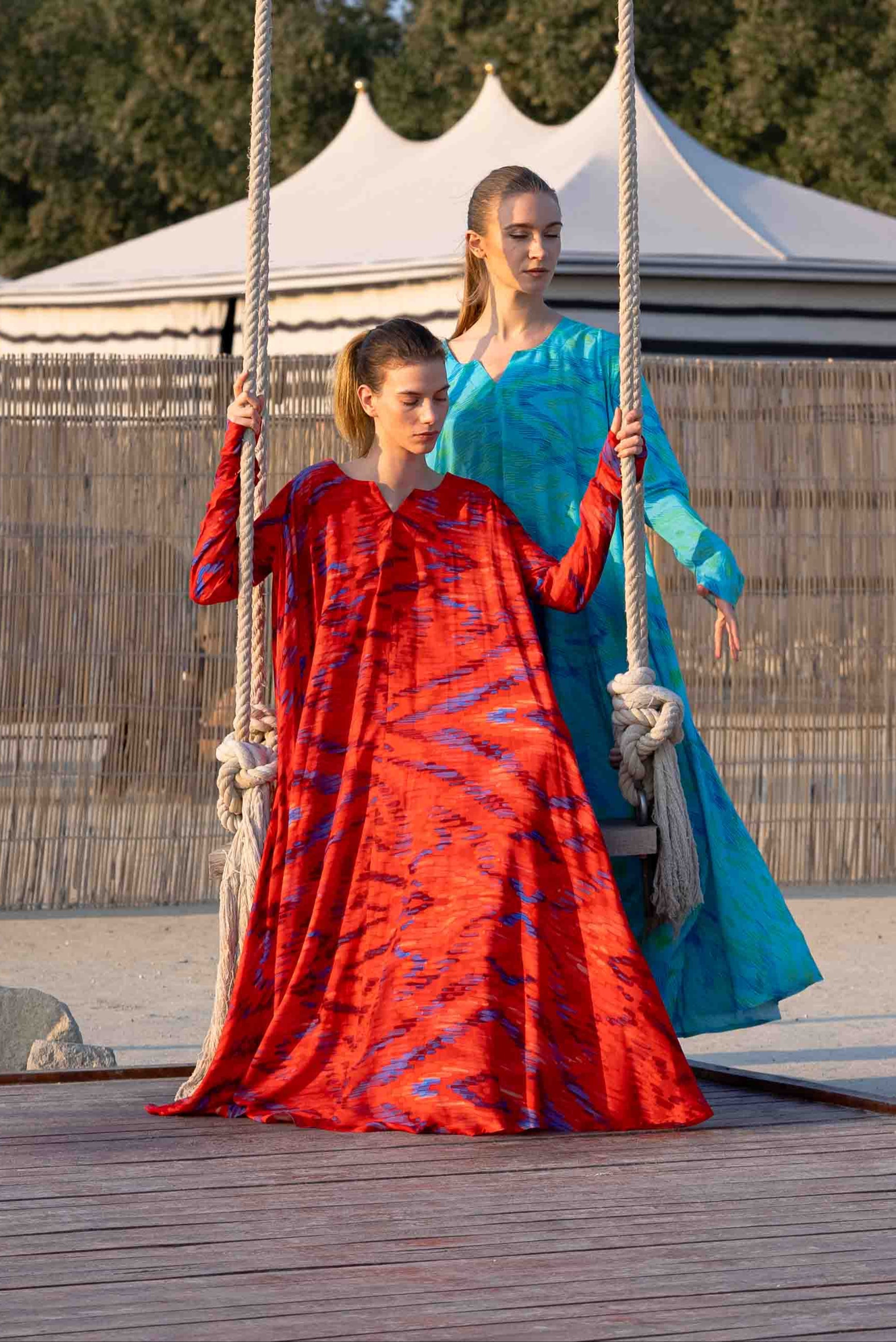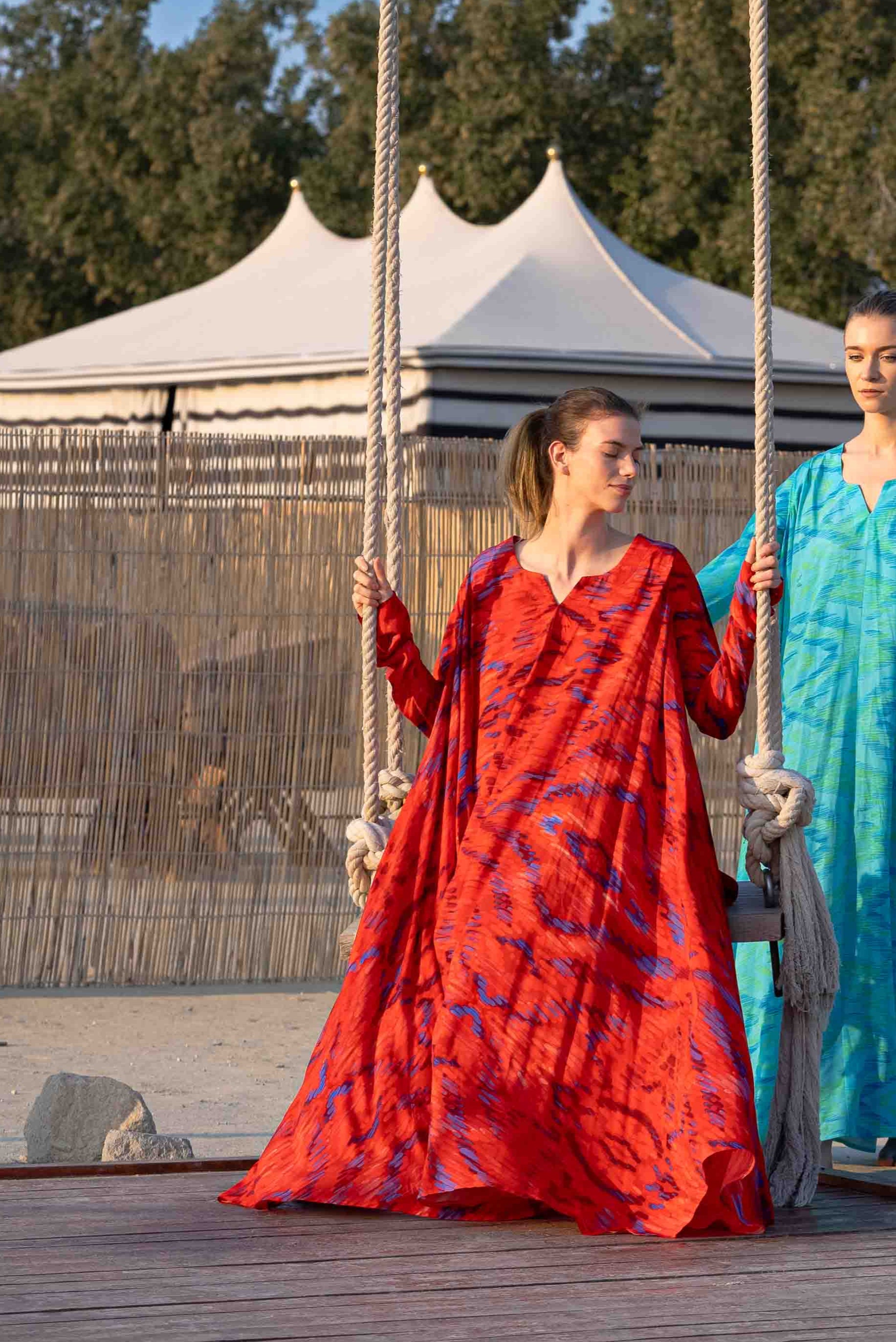 Make a bold and unforgettable statement with the Scarlet Reflection Kaftan, featuring striking red tones blended with abstract blue patterns. Crafted from a luxurious cotton silk blend, this long-sleeve kaftan delivers a soft, breathable, and lightweight feel. Its flowy silhouette ensures comfort and elegance, perfect for evening events, casual gatherings, or resort wear. Available in sizes S, M, L, and XL for a flattering fit.