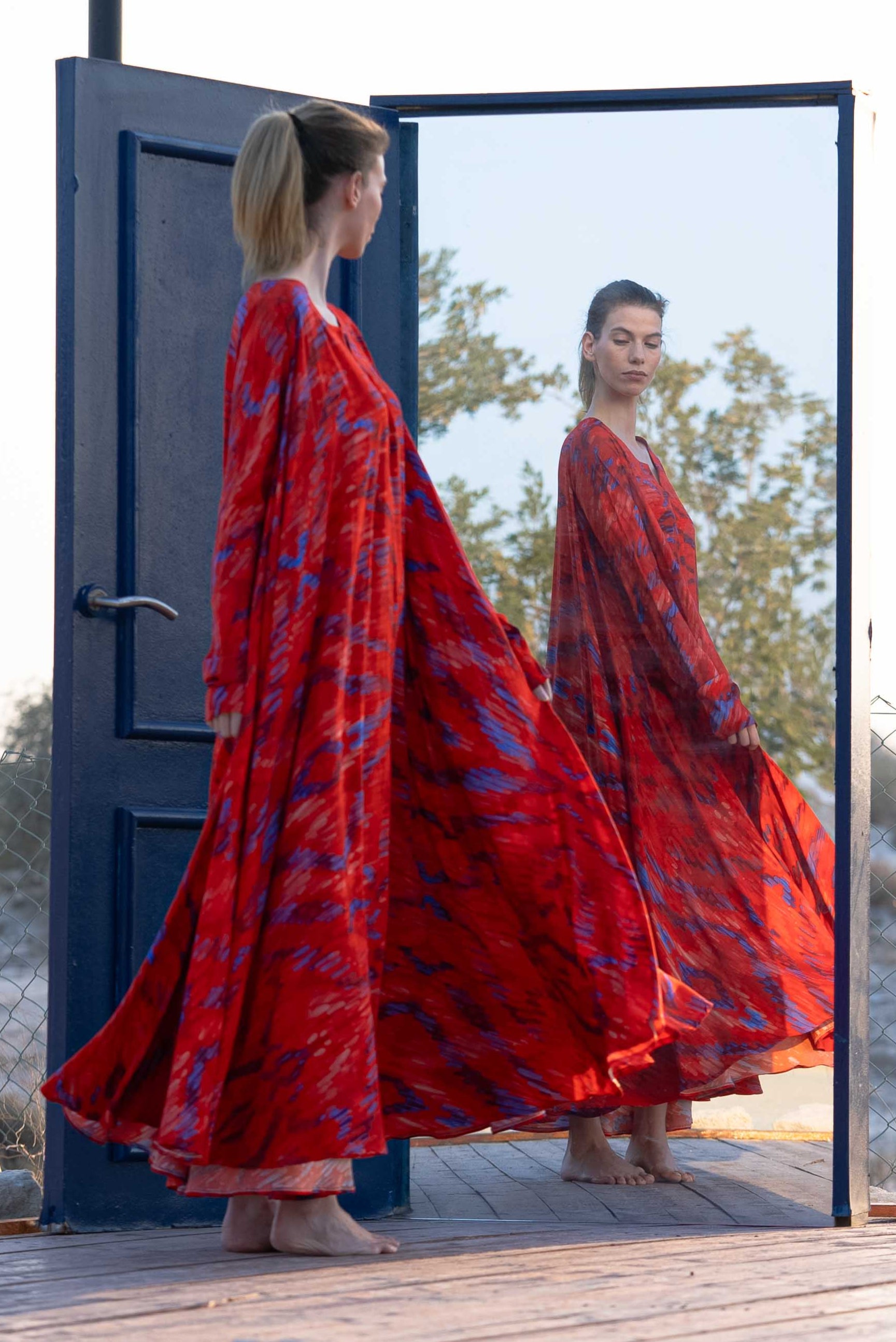 Long-Sleeve Kaftan – Cotton Silk Blend, Sizes S to XL, Red Abstract Print