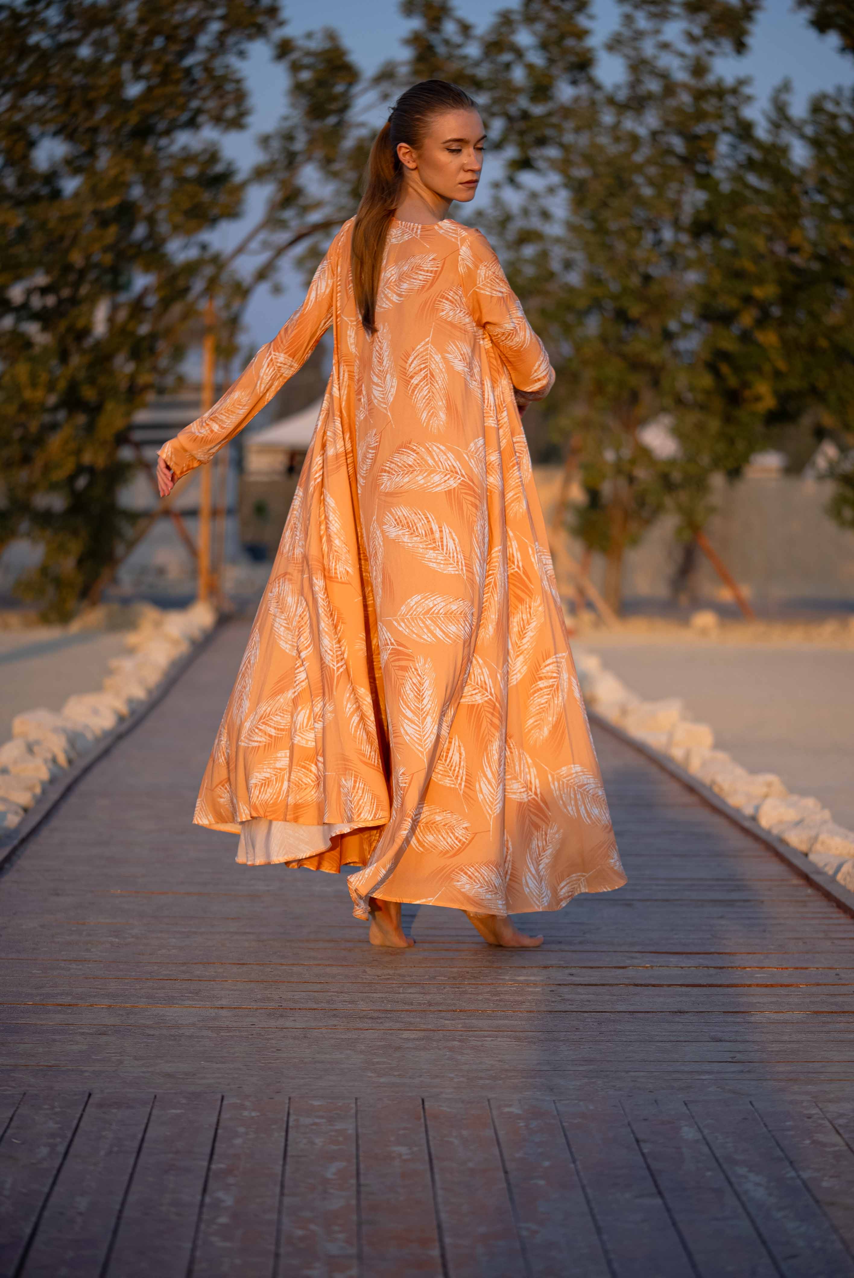 Embrace effortless elegance with the Sunset Palm Kaftan, featuring soft palm leaf prints in warm sunset tones. Made from a luxurious cotton silk blend, this long-sleeve kaftan offers a breathable and lightweight feel, perfect for any occasion. Its flowy design provides a relaxed fit while exuding sophistication. Available in sizes S, M, L, and XL for a flattering fit.