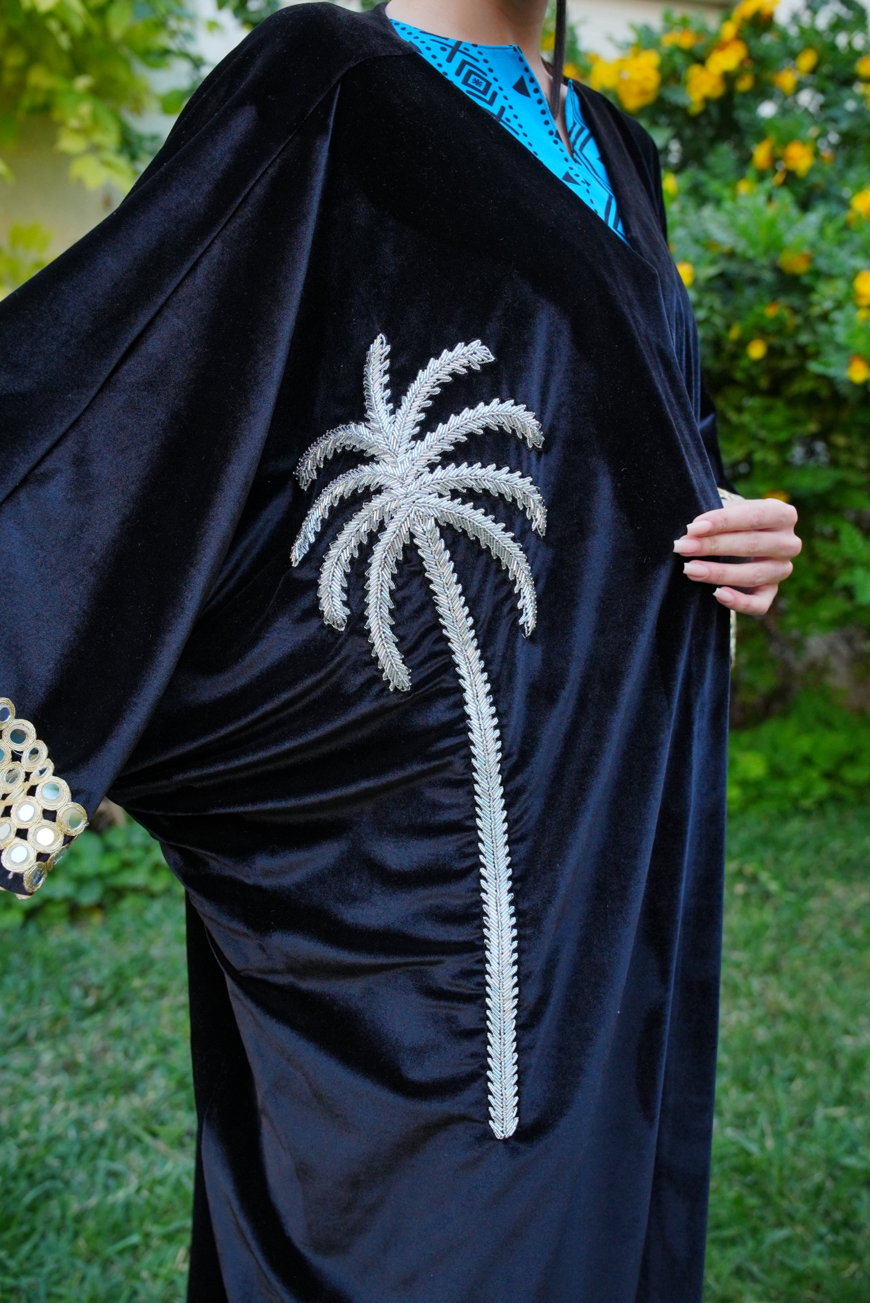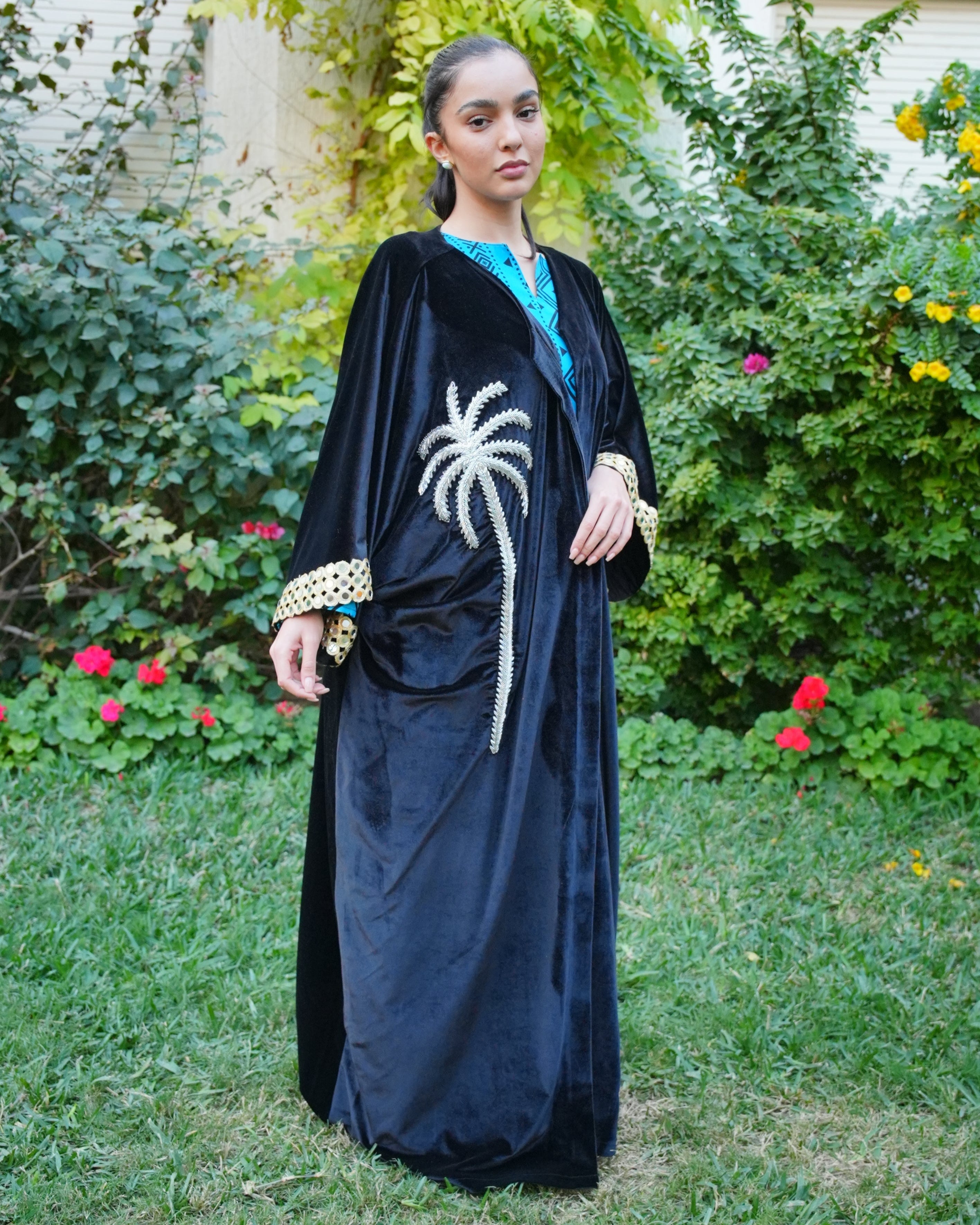 Elevate your style with this limited-edition black velvet bisht, featuring shimmering silver palm embroidery and intricate sleeve details. With only two pieces available, this timeless design is a true treasure for your wardrobe.