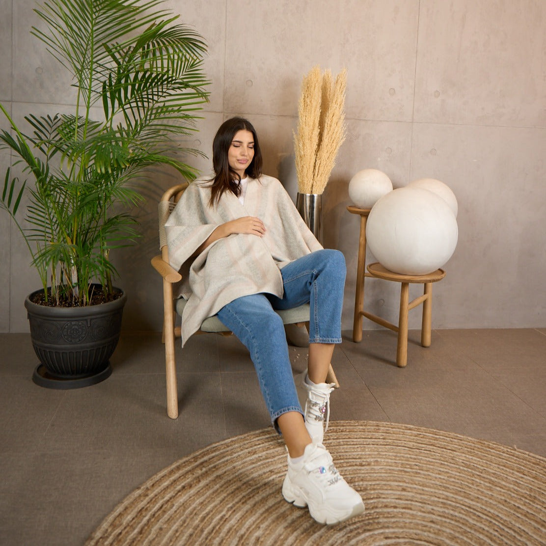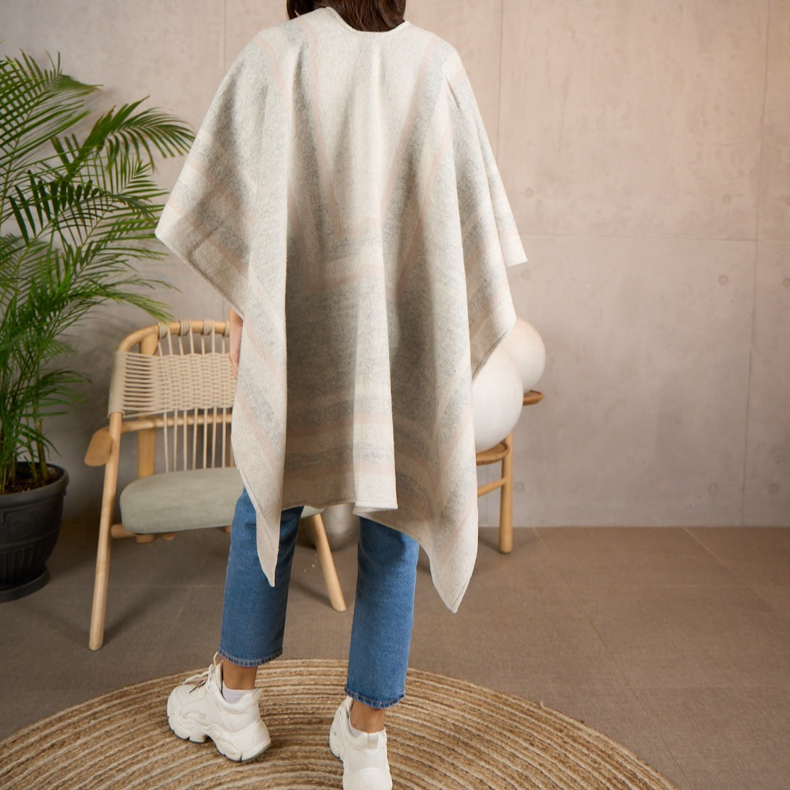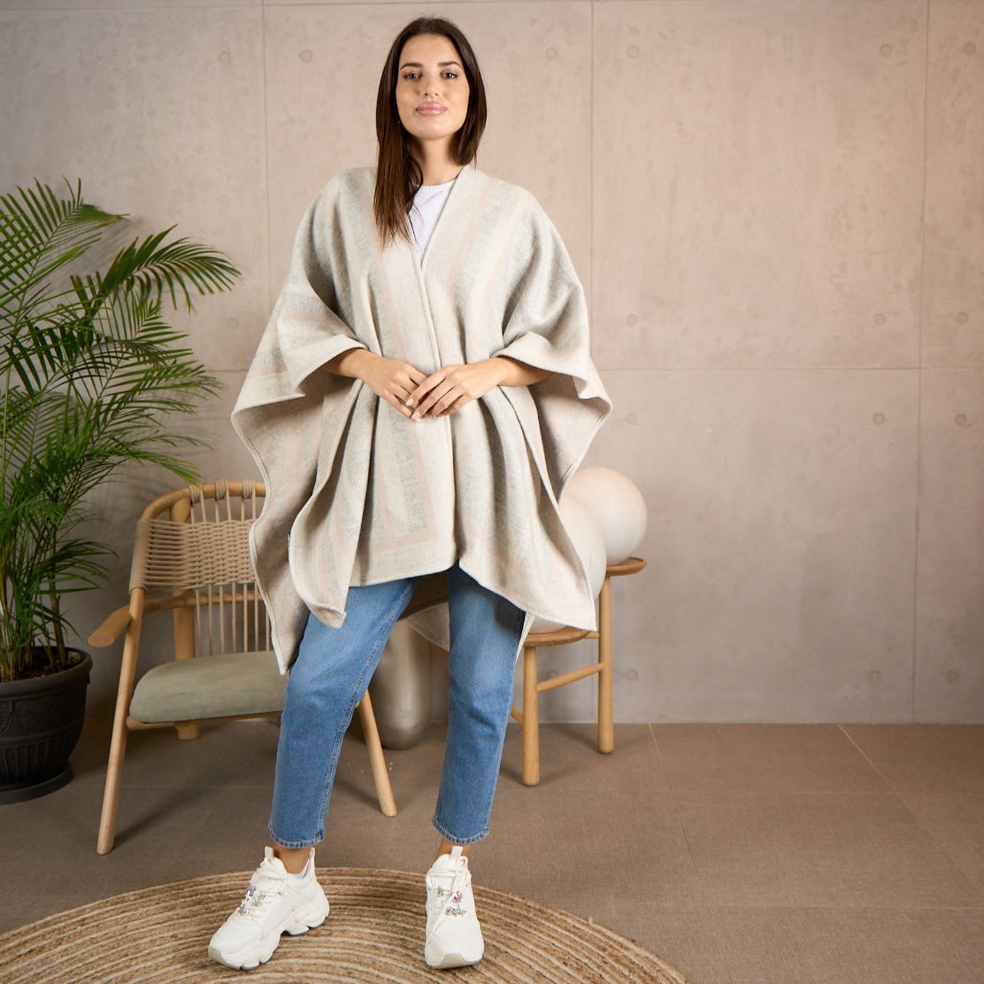 The poncho features a classic design that is both elegant and sophisticated. It can be worn with any outfit, from a casual day out to a formal event. The poncho is also perfect for travel, as it is lightweight and easy to pack.