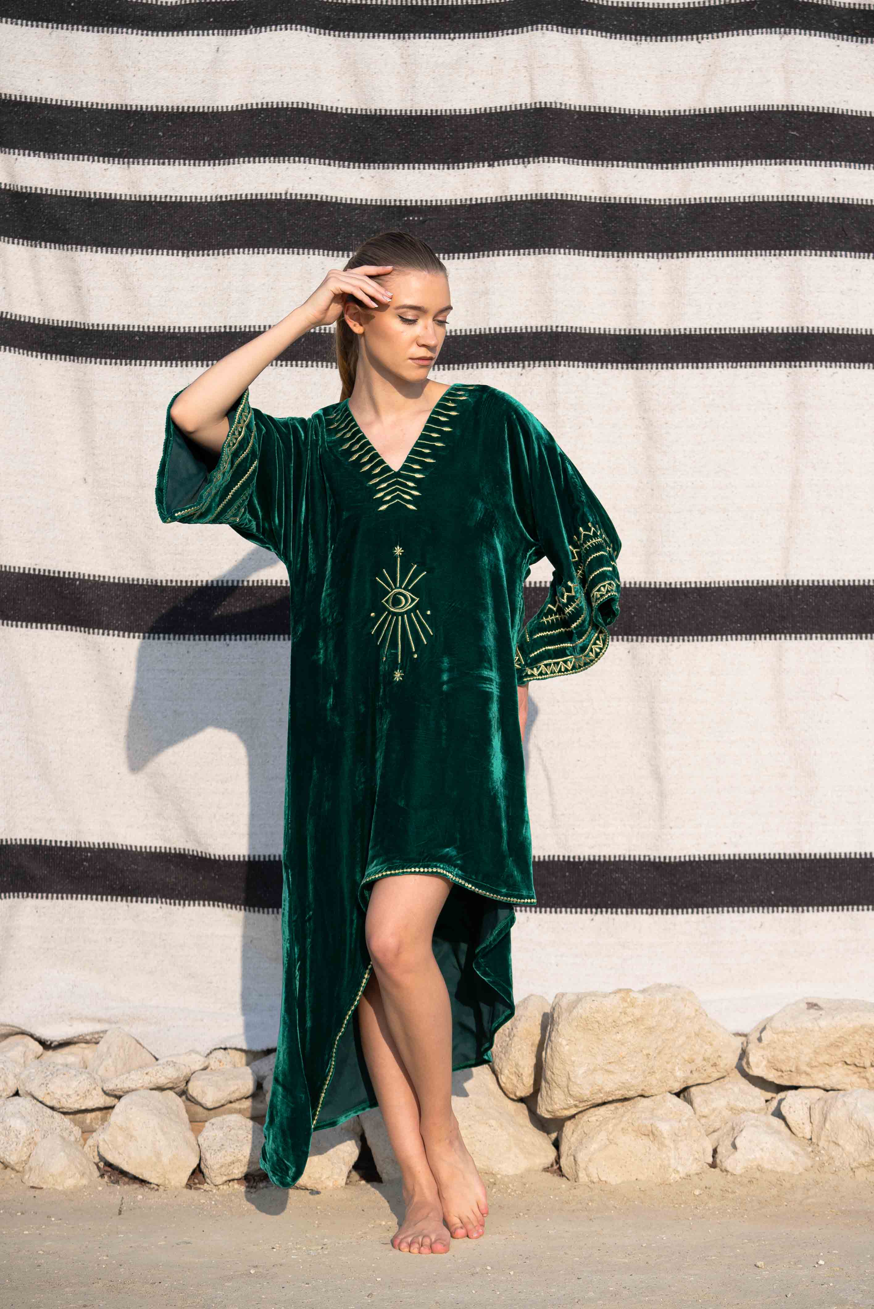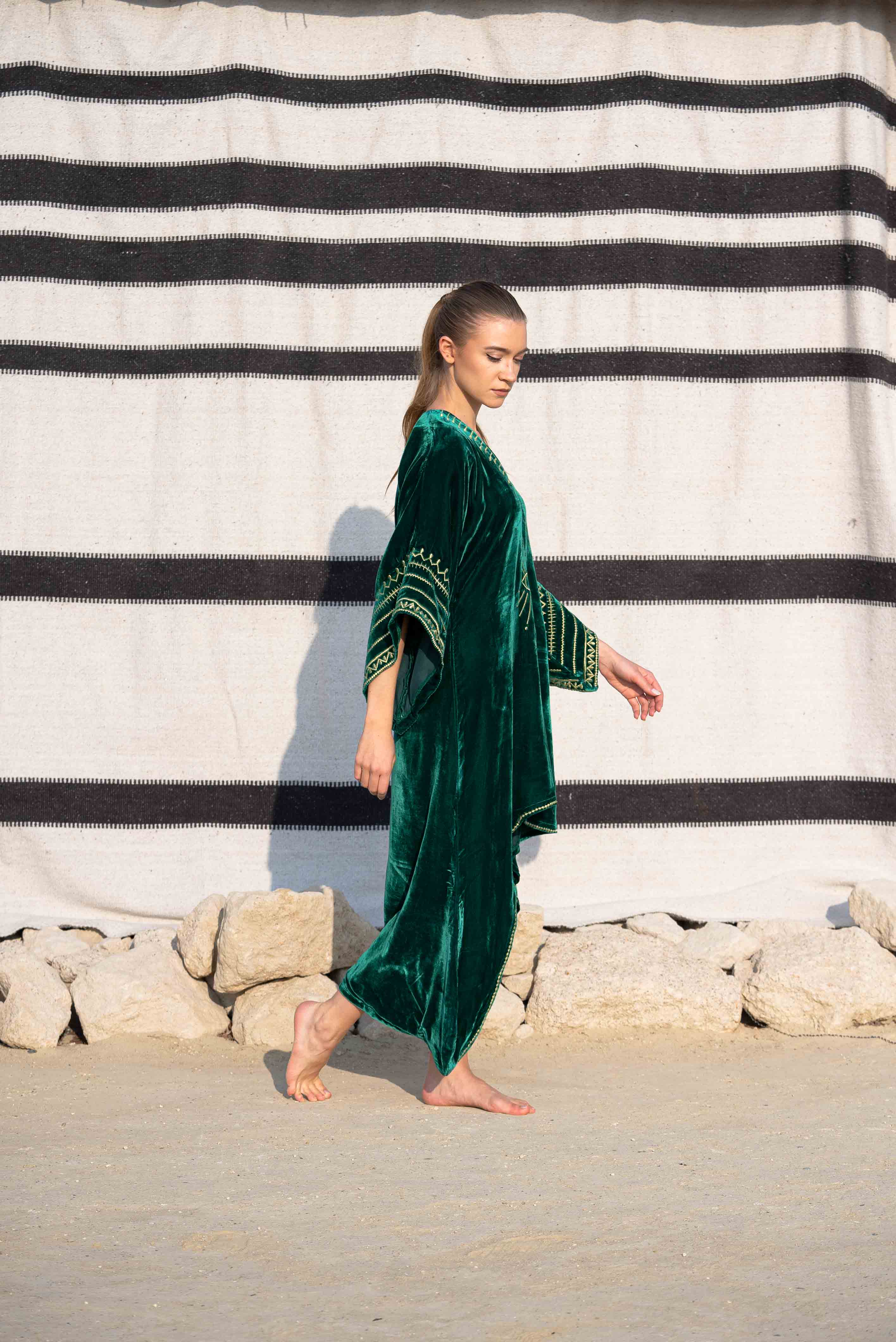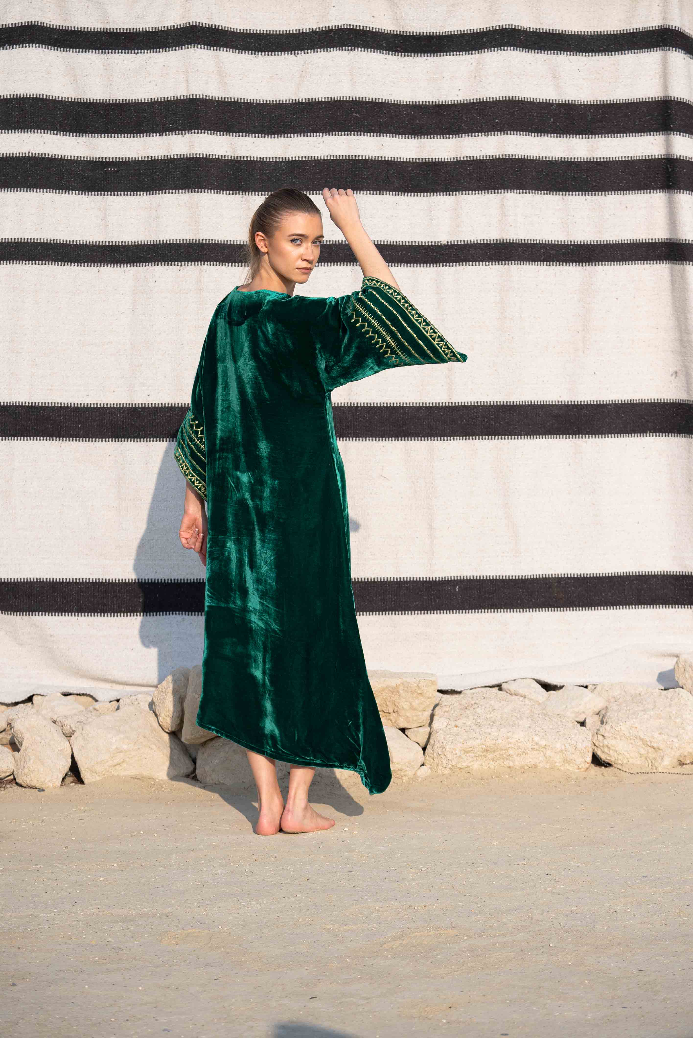 Deep Forest Green Velvet Kaftan with Hand-Embellished Silver Motif