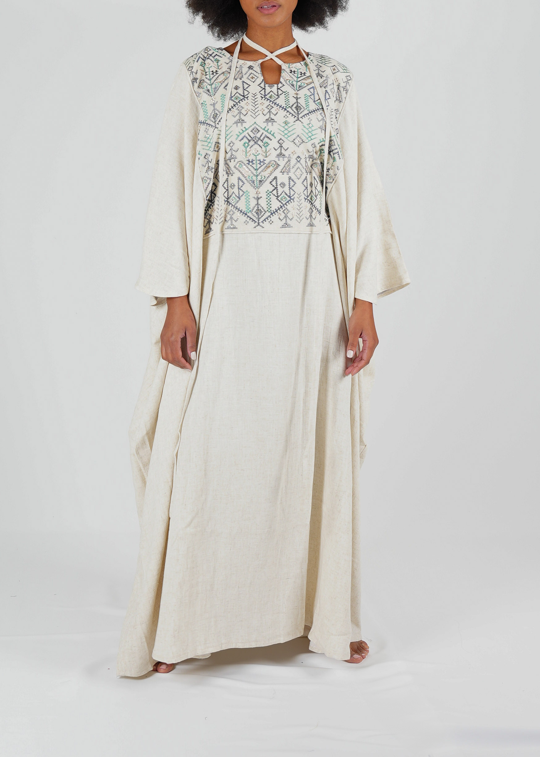 Linen Kaftan with Colorful Embroidery - Natural Elegance (55-Inch)