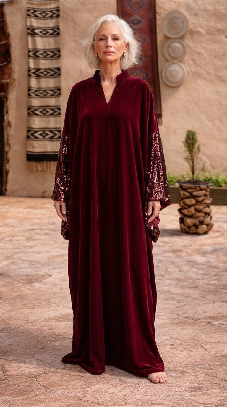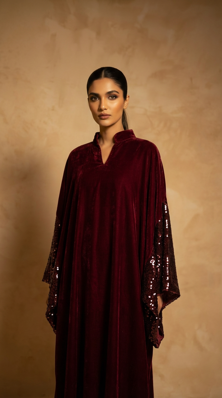Maroon Velvet Kaftan with Sequins Sleeves